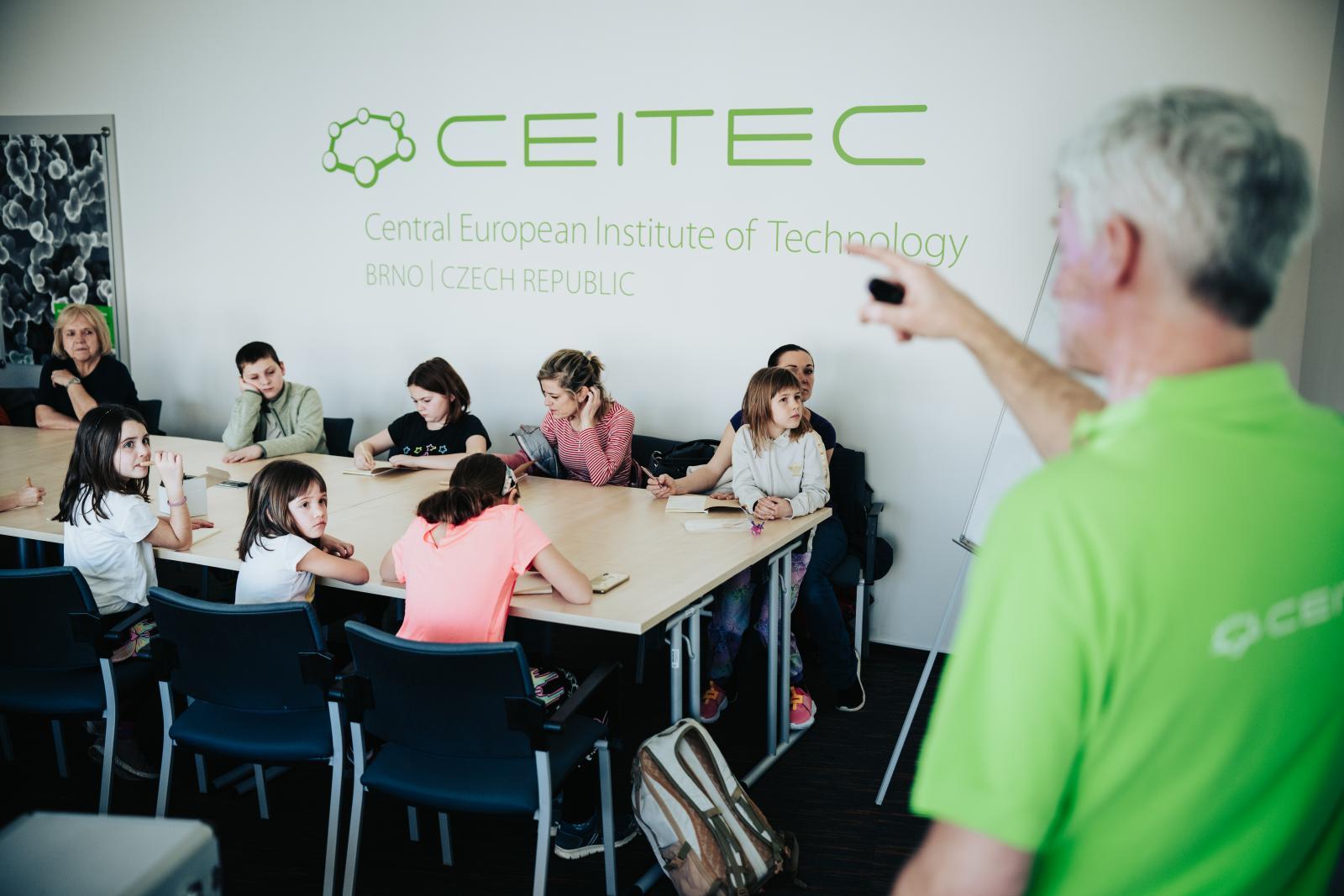 In March, CEITEC traditionally joined the Electron Microscopy Days. Both our campuses in the week of 18-23 March 2024 came alive in the spirit of this popularization event organised by Brno Observatory and Planetarium, which involves a number of partners spread throughout Brno. Every year, universities, scientific and popularization centres and manufacturing companies open their doors to the general public, especially children, and prepare rich programmes for them: from lectures to excursions to laboratories and production facilities to scientific games and experiments. The theme chosen for this year was “Villains of the Microworld”. Each institution handled the theme differently, so the main villain was the mite, the symbol of this year’s Electron Microscopy Days, but also viruses at CEITEC MUNI or electrons at CEITEC BUT. Hundreds of people visited the various lectures, exhibitions and experiments at CEITEC this year – from schoolchildren on field trips to families with children during the weekend programme.