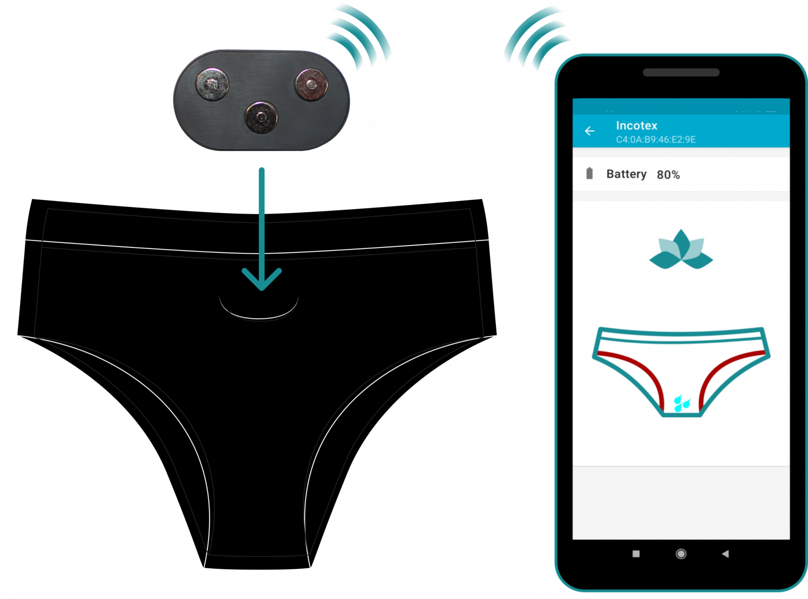 The culmination of the entire smart system is the mobile app that records individual instances of urine leakage throughout the day. It also warns the wearer or the caregiver of possible leaks. Stored data can then be shared with a doctor to tailor incontinence treatment.
