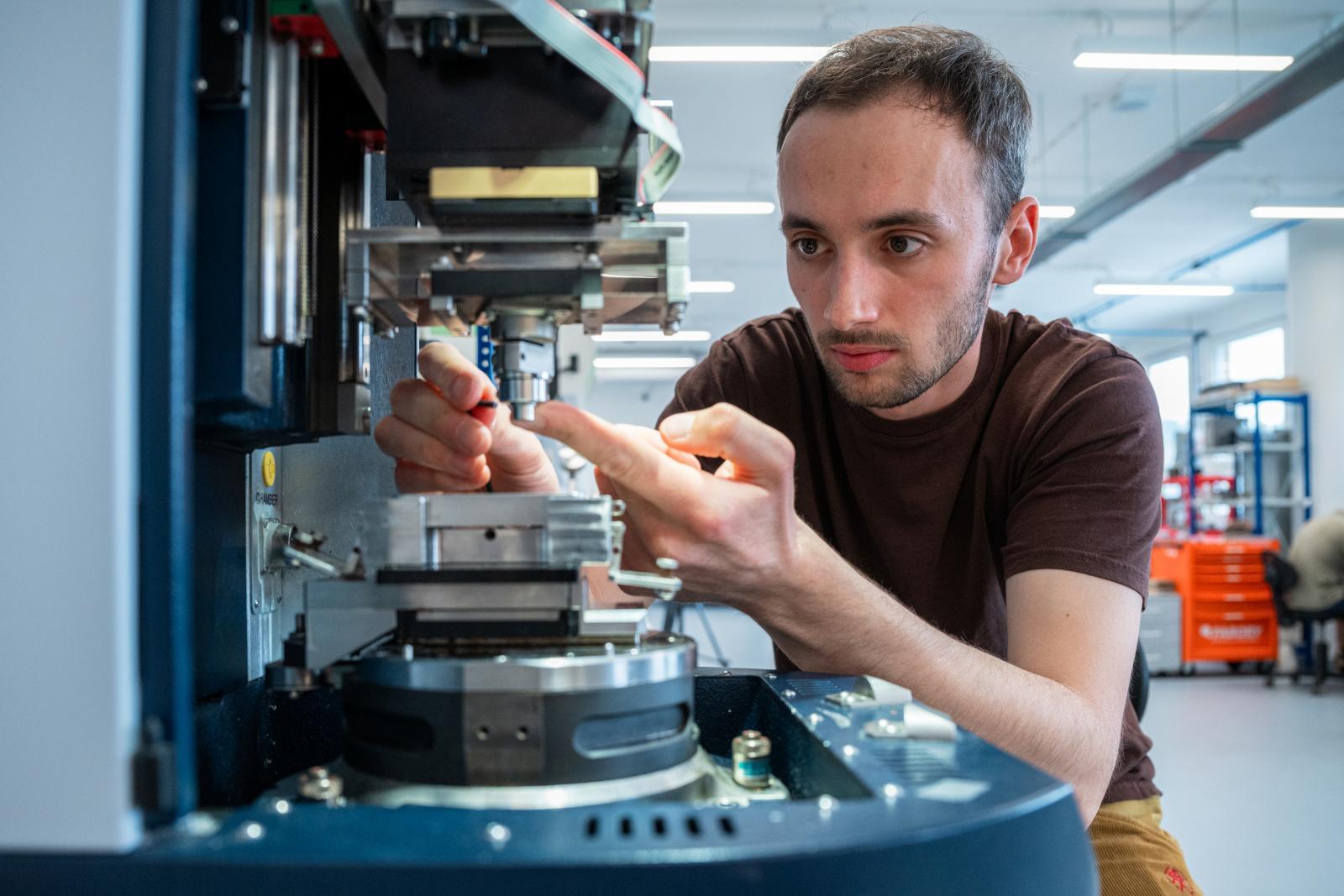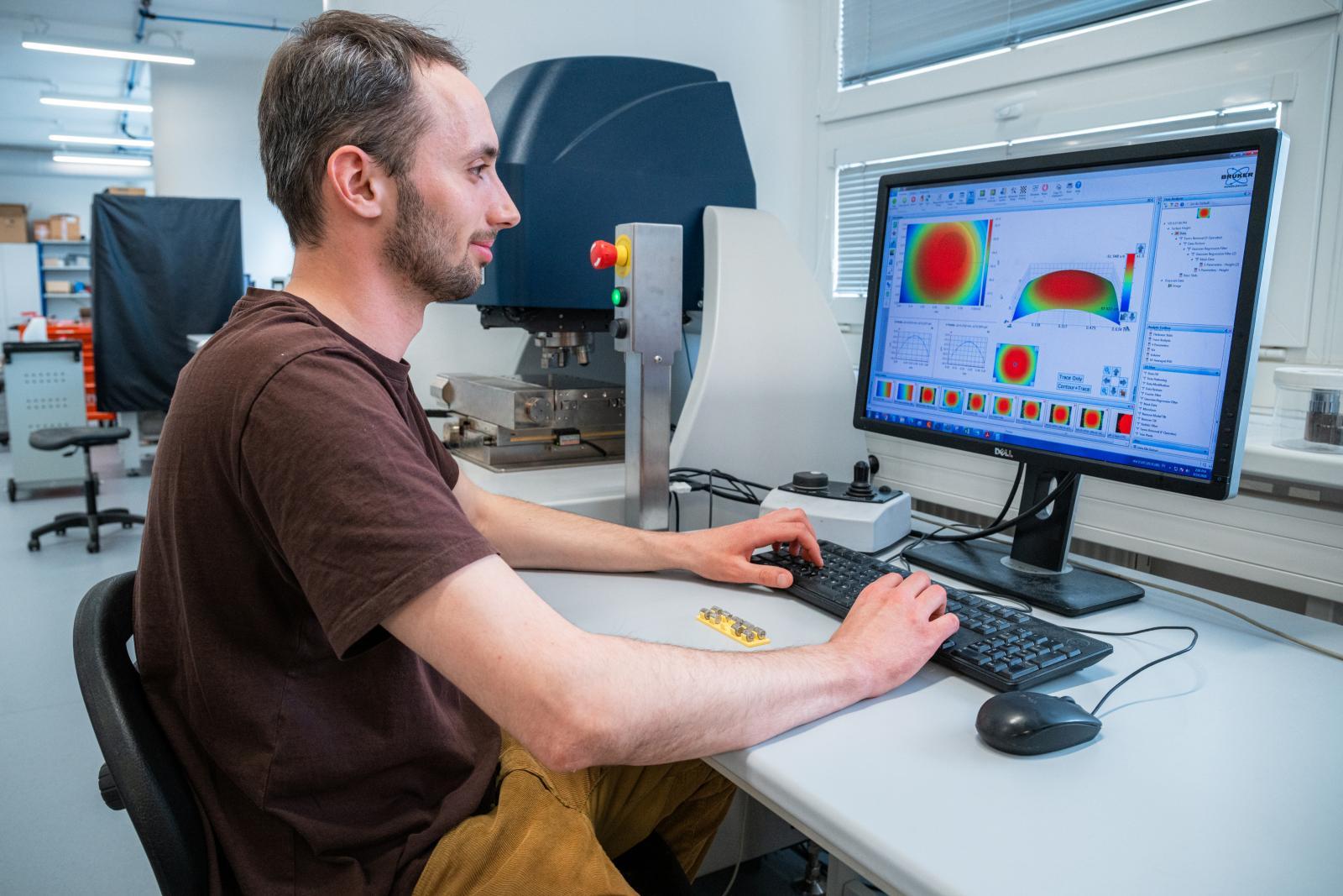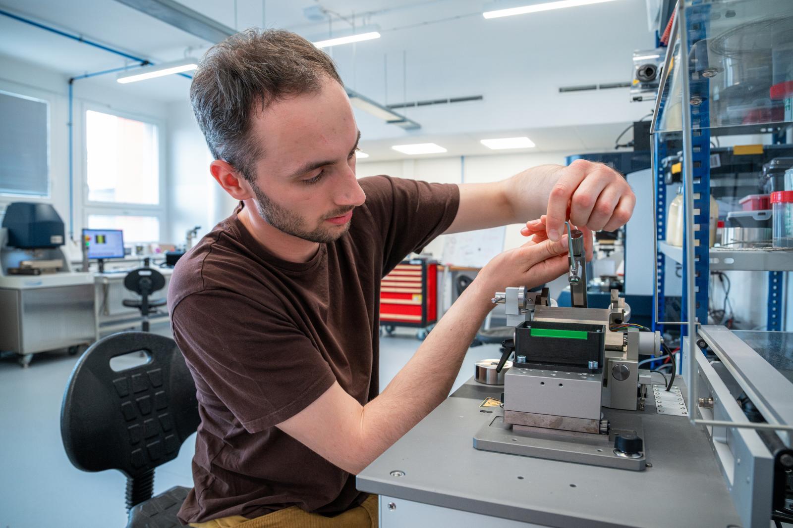 „Nechtěl jsem dělat čistou strojařinu, lákalo mě něco s přesahem. Biotribologie je takový úkrok od inženýrství do medicíny,“ říká doktorand Daniel Němeček z Ústavu konstruování, který se oblasti věnuje už od bakaláře. Tehdy testoval kyčelní náhrady s texturovaným povrchem, později se posunul k hydrogelům, které mají ambici napodobit přirozenou chrupavku.