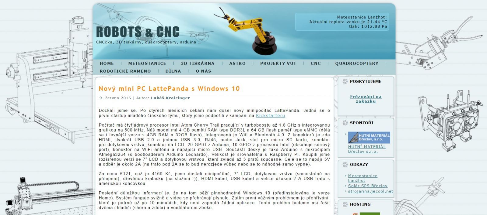 Když se sejde strojař a programátor, vznikne spousta zajímavých věcí. Takové je heslo dvou studentů VUT, kteří píší blog Robots&CNC. Původně vznikl jen pro kamarády jako prostředek ke sdílení fotek z tvorby různých projektů, např. meteostanice nebo 3D tiskárny. Dnes mají stránky stovky čtenářů a mezi nimi i několik zájemců o spolupráci.
