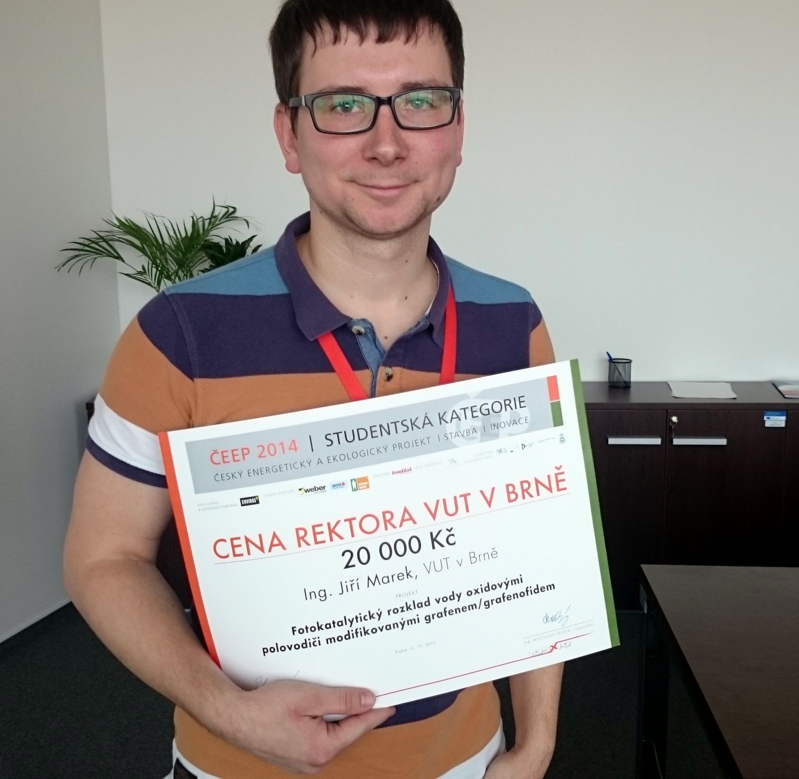 Doktorand chemické fakulty napsal diplomovou práci na téma Fotokatalytický rozklad vody oxidovými polovodiči modifikovanými grafenem/grafenoxidem, která zaujala vedoucí ústavu na fakultě, a tak mu nabídla, aby ji přihlásil do studentské kategorie soutěže ČEEP (Český energetický ekologický projekt). „Nejdříve jsem se podivoval, že bych měl práci na chemické téma přihlašovat do stavařské soutěže. Soutěž však není omezena jen na projekty z oblasti stavebnictví, ale zaměřuje se také třeba na životní prostředí, obnovitelné zdroje energie a zemědělství. A přesně na to pasovala moje diplomka,“ vysvětlil mladý vědec.