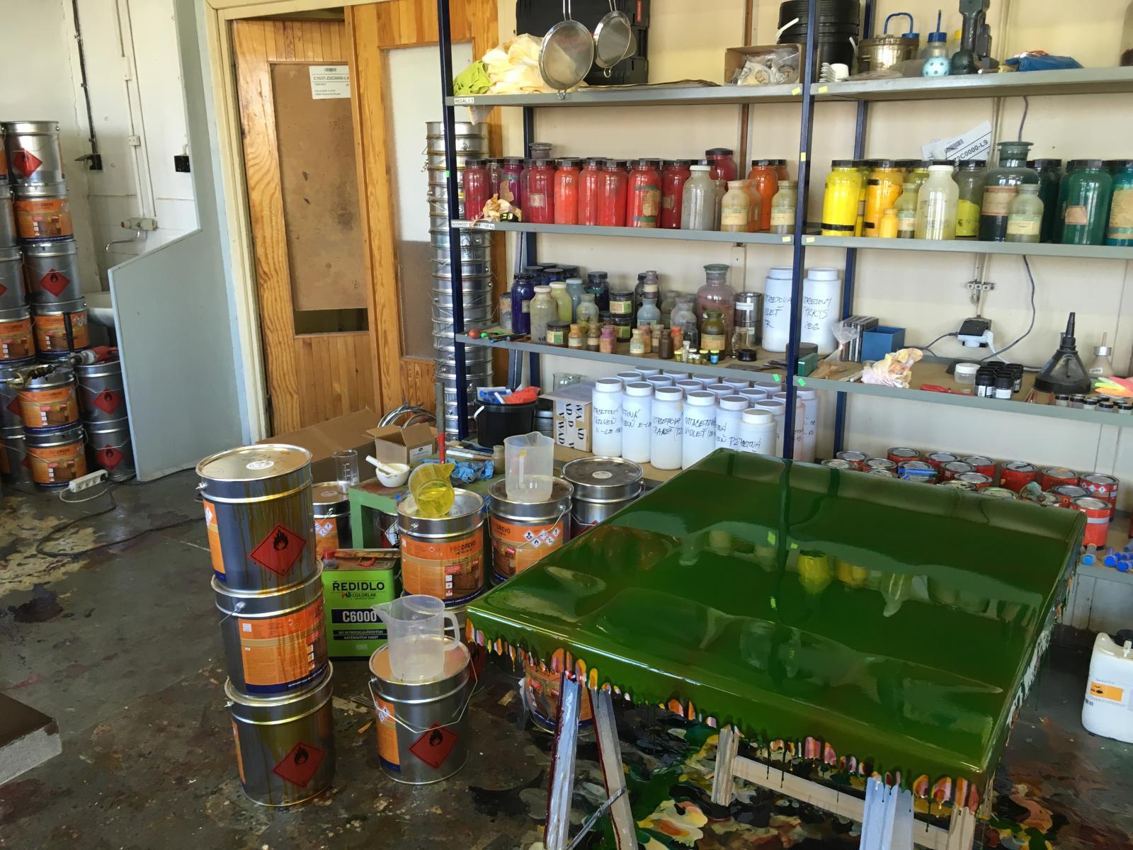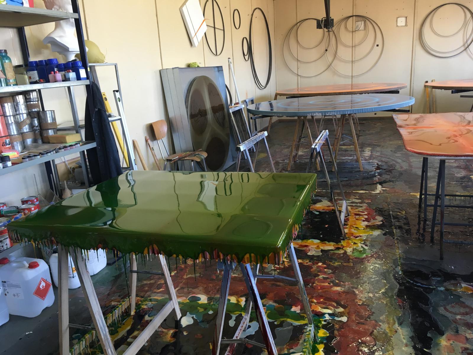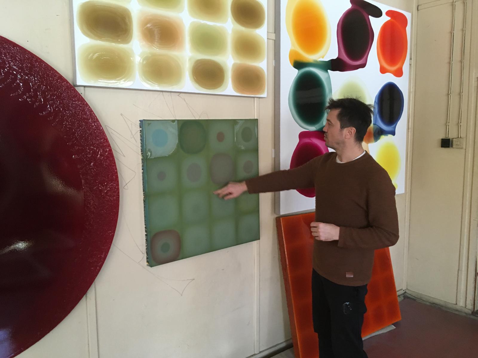 Ano. Já se pohybuji na hranici mezi 2D malbou a objektem. Nevěnuji se zobrazování v rovině malířství, ale rozvíjím možnosti abstrakce právě za použití nových technologických postupů, k nimž jsem se propracovával dlouhodobě a vlastně i složitě. Opakovaně nalévám na plátna velké množství laku a nechávám jej dál do jisté míry „samostatně“ pracovat. Nechávám si vyrábět speciální lak se změkčovadly, takže výsledný materiál je měkčí než ten klasický, a přimíchávám do něj pigmenty, barviva nebo kovy. Na jeden obraz například naliju až šedesát litrů laku. Pak ty objekty schnou, já je nakláním a laky začínají stékat. Je to takový tělocvik, taková gymnastika barvy. Některé obrazy vznikají i dva roky. Jsem spíš prostředník toho tvořivého procesu a baví mě jeho dynamika. Moje tvorba není o příbězích, ale o vidění a vnímání. To je věc, kterou bych chtěl předávat studentům.