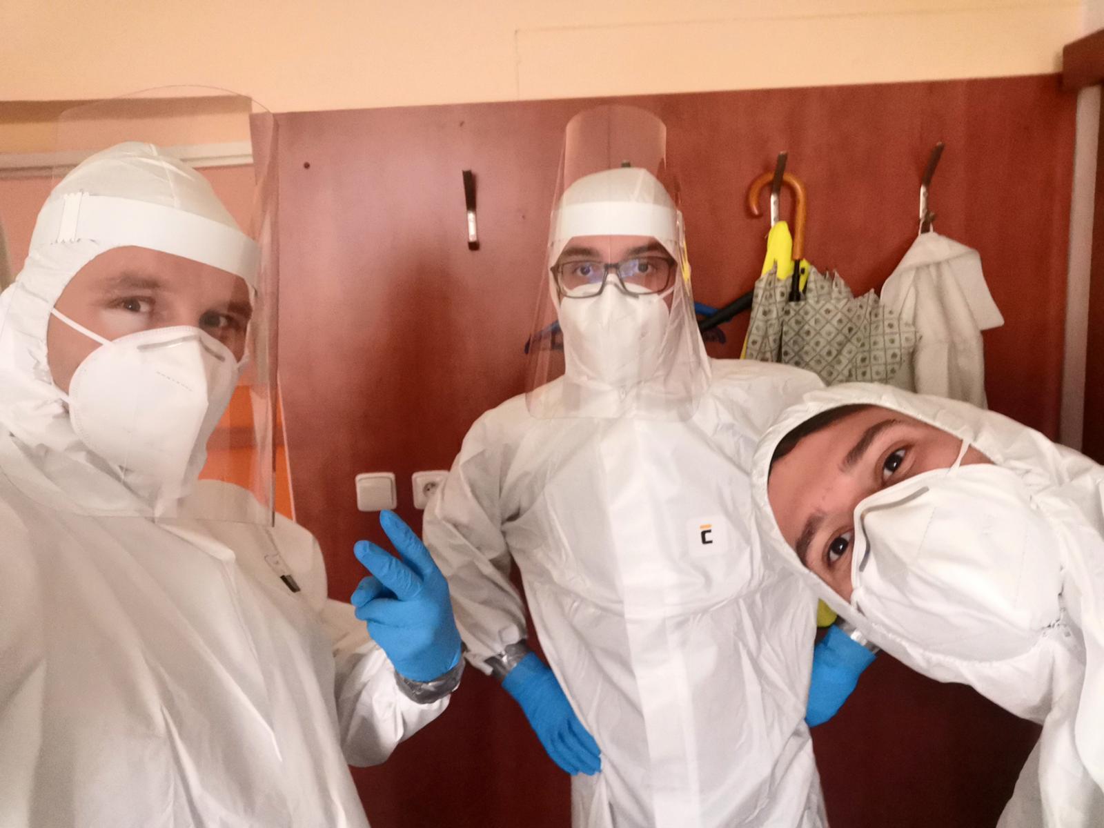 Směna trvá osm hodin. Po příjezdu se vždycky převlečeme do ochranných pomůcek – celotělového obleku, štítu, respirátoru a rukavic. Pak ještě lepicí páskou zalepíme rukávy a další místa. Za patnáct minut jsme připravení vyrazit do práce. Vedoucí domova nebo směny nás potom rozdělí mezi sestry a zkušené zaměstnance. Dostaneme úkoly a ty plníme. Můžeme pomáhat s krmením, převlékáním postelí, úklidem, doplňováním zásob, rozvozem jídla, ale třeba i holením.