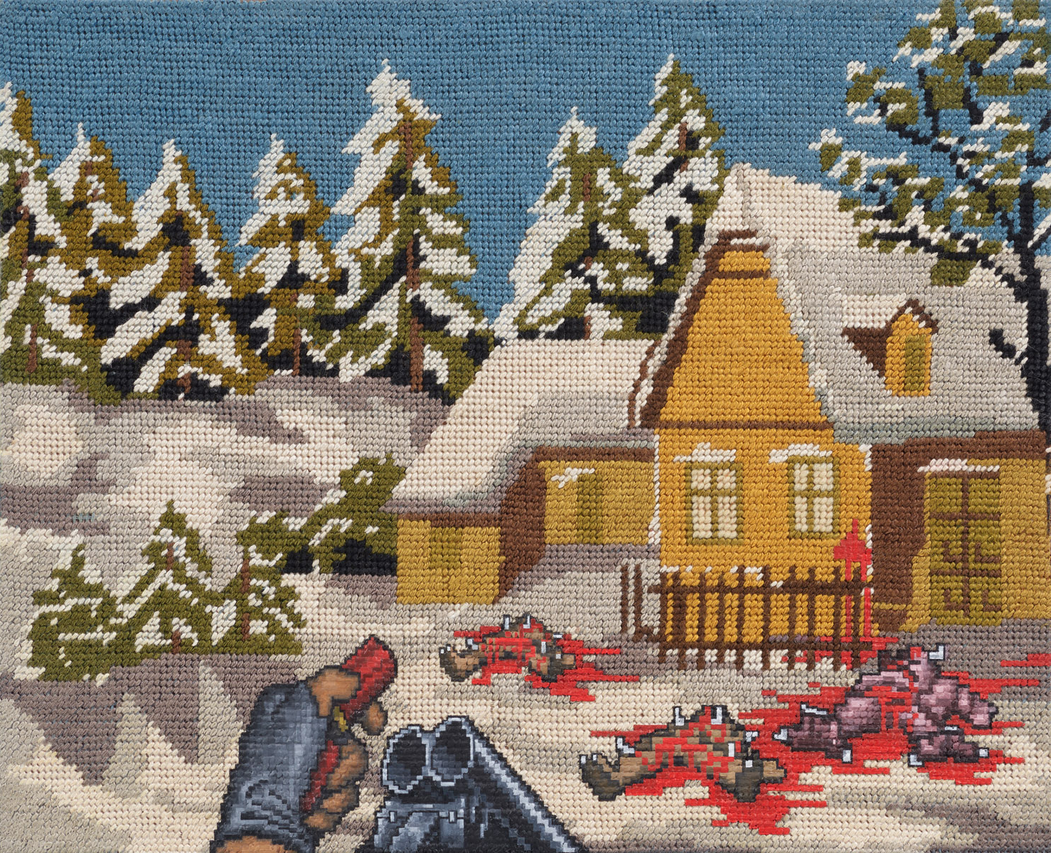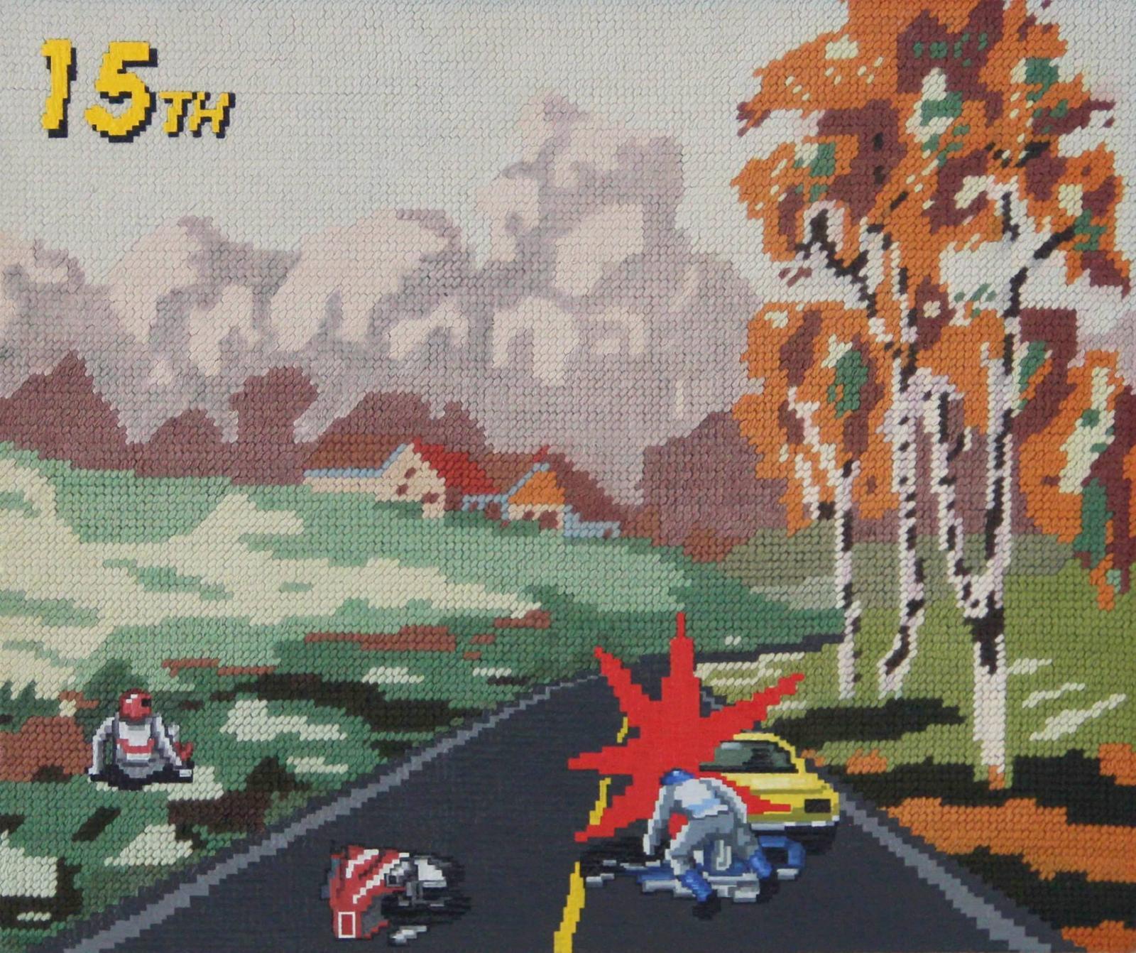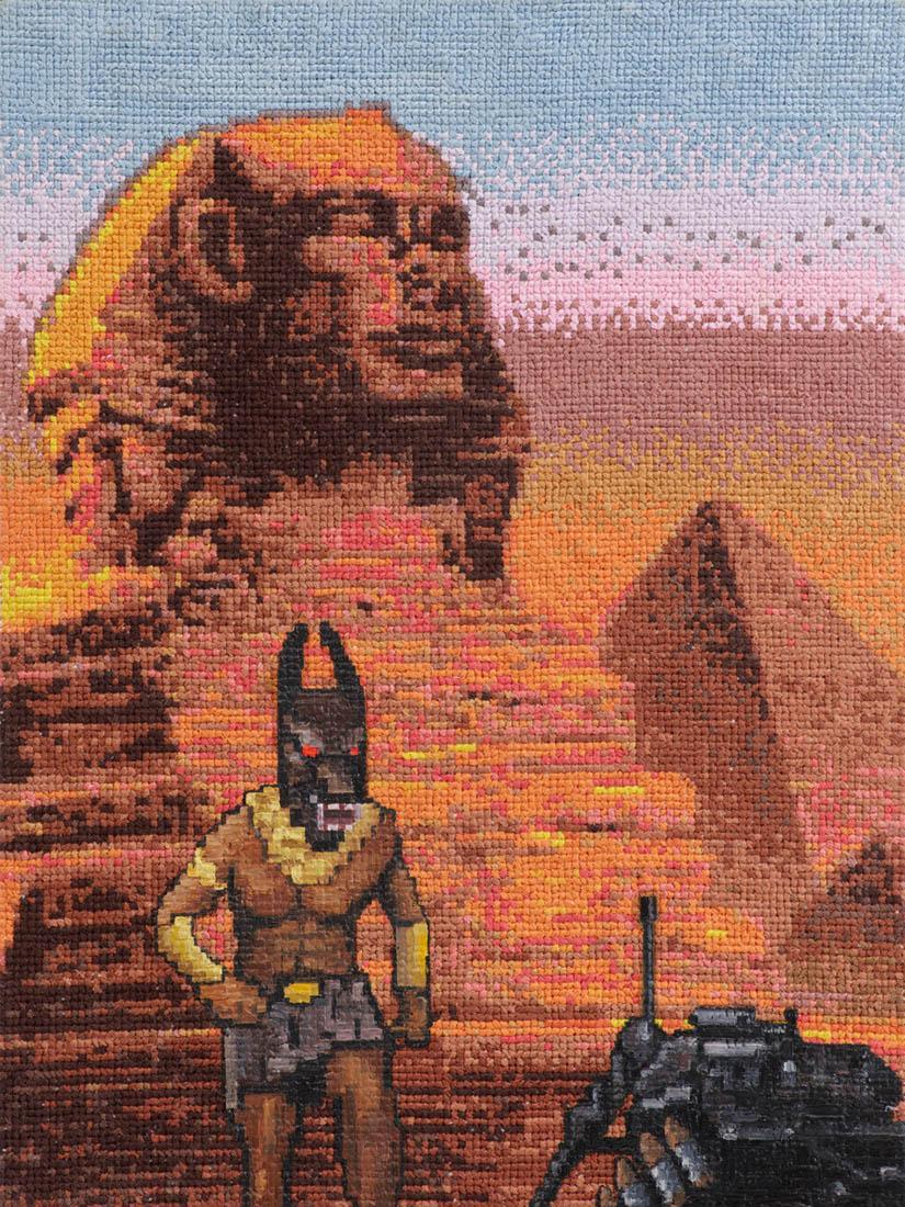 Hledal jsem technologický postup – dovyšívat jsem je nechtěl, a to z mnoha důvodů. Musel bych držet rastr výšivky, který má mnohem menší rozlišení než většina těch herních motivů, které tam dotvářím. Začal jsem proto obrázky domalovávat. Malba mi poskytuje více prostoru a možností. Vzniká tak doslova další vrstva nostalgie, která vytváří nový význam té původní. Vyšívané obrazy sháním a nakupuji v bazarech či v různých vetešnictvích.