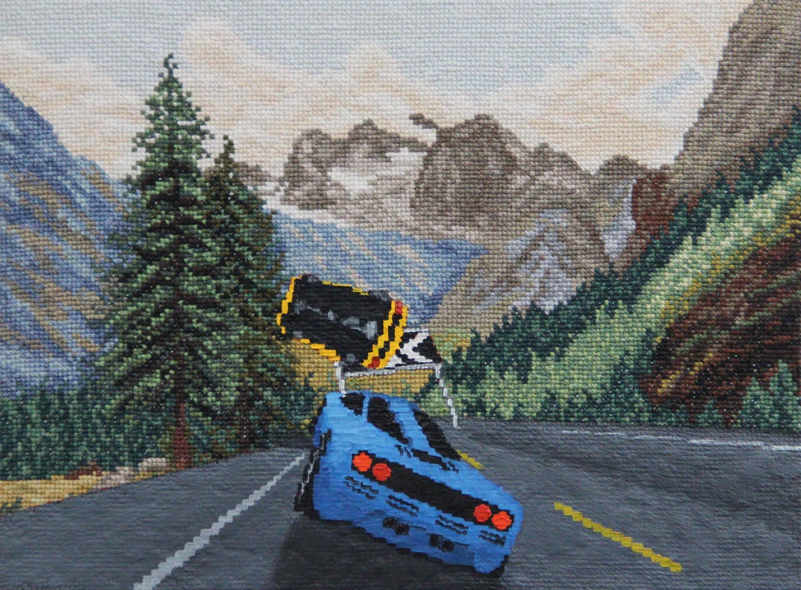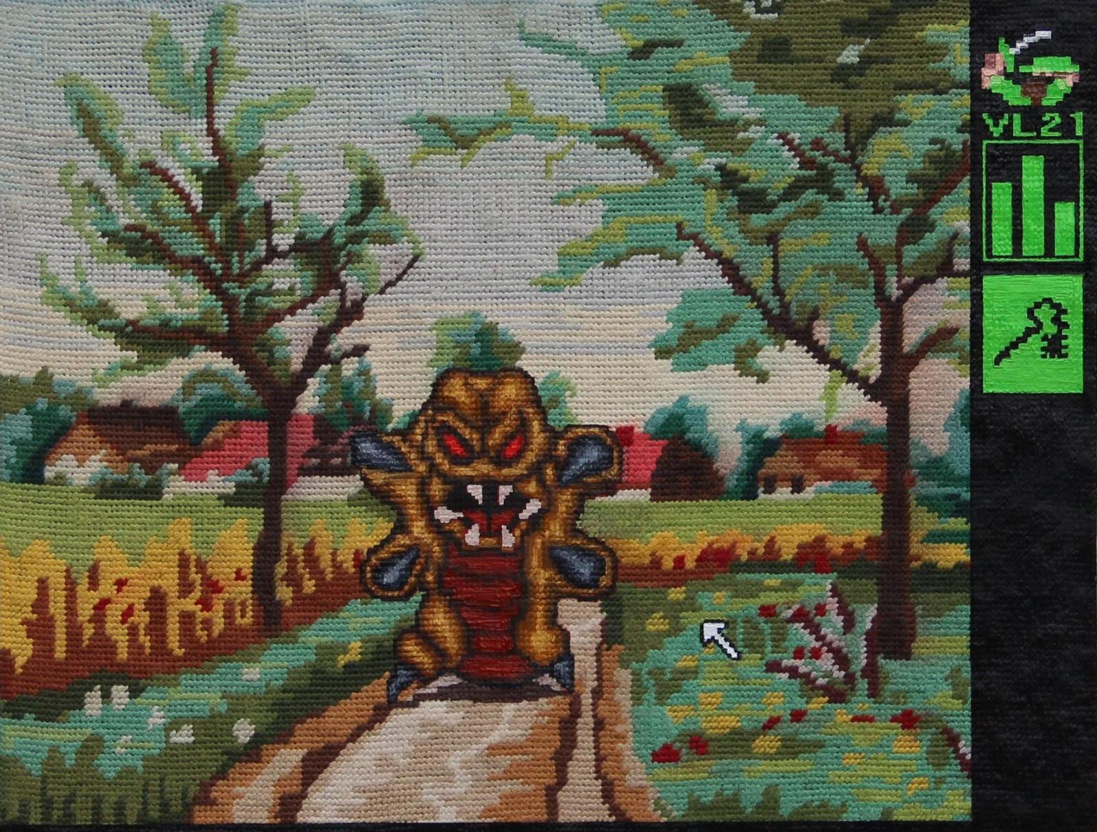 Před lety jsme vyklízeli byt po babičce a našlo se tam pár vyšívaných obrázků, které jsem si nechal. Hned se mi nabízelo je nějak přetvořit. S principem recyklování a vrstvení už jsem pracoval dříve. Vyšívané krajinky mi připomínaly prostředí ze starých devadesátkových videoher. Pixelová grafika stejně jako křížová výšivka používá rastr, takže jsou si vizuálně velmi blízké.