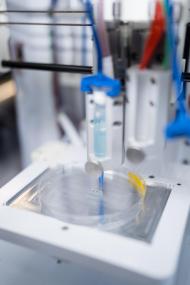 Speciální tiskárna pracuje s bioinkoustem, který může svým složením posilovat konkrétní oblast regenerace, například obsahuje látky k hojení kůže, kostní tkáně nebo chrupavek. Tento biokompatibilní materiál vytlačují dvě zahřívané trysky na připravenou misku. Pod ní se nachází vyhřívaný stoleček, aby bylo možné zachovat požadované vlastnosti vytisknutého objektu. Jak upozorňuje vedoucí pětičlenného týmu, netisknou zde přímo umělé orgány, ale například jejich části či kusy tkání. Nejrůznější tvary a struktury pomáhají odborníkům ve výzkumu buněčného a tkáňového inženýrství | Autor: Jan Prokopius