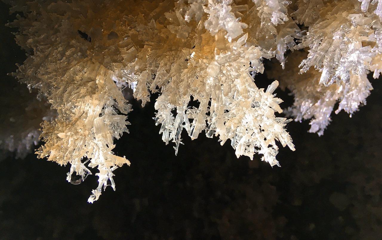 Před expedicí jsem narazil na starou studii ukrajinského hydrogeologa. Tvrdil, že minerální prameny vytékají ze Sulfuru – a tím pro něj příběh skončil. Na místě byl, ale nikdy nešel dál. Možná neměl čelovku. I renomovaní odborníci někdy přehlédnou zásadní věci. Sádrovcové krystaly jsou běžnou sekundární výplní hypogenních sirovodíkových jeskyní. | Autor: Archiv Marka Audyho