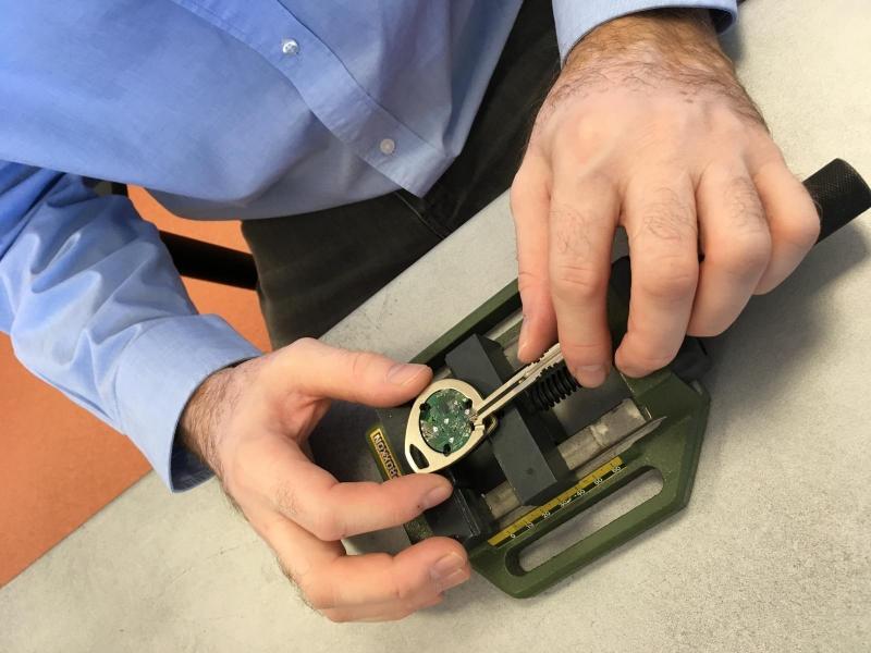 Jiné systémy využívají ke komunikaci mezi klíčem a zámkem dva vodiče. Jedním je vedeno napájení zámku z klíče a druhým se posílají data. V našem zámku je ale pouze jeden vodič, kterým přenášíme nejen zašifrovaná data o tom, zda má člověk do objektu přístup, ale i zmíněnou energii k odemknutí zámku. V tom přístupu je náš systém odlišný a tuto komunikaci bychom chtěli nechat patentovat,“ dodal Šteffan, který na vývoji zámku ePRO pracoval s dalšími kolegy z Ústavu mikroelektroniky přes tři roky.