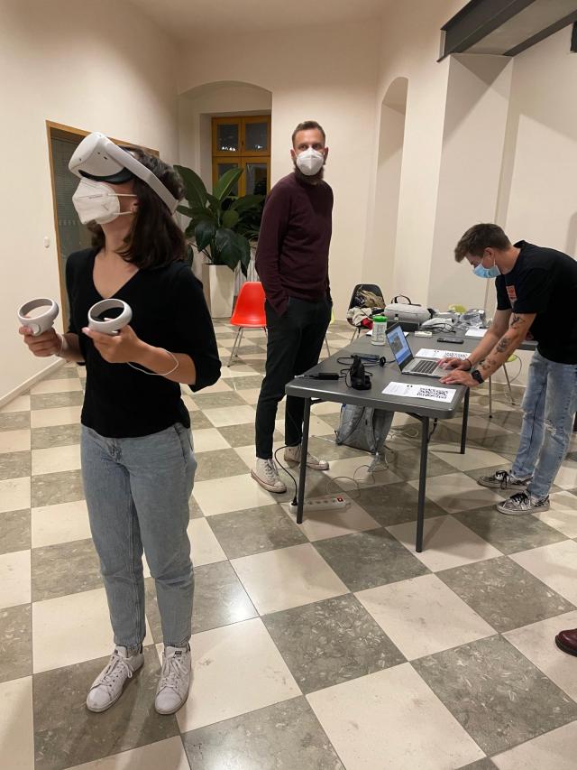 Po prožitých pandemických letech se začínají ordinace psychologů, psychiatrů i terapeutů plnit lidmi, u kterých se projevuje posttraumatická stresová porucha v důsledku hospitalizace či těžkého průběhu koronavirového onemocnění. Situace, do které se odborníkům s klientem v běžné ordinaci těžko vrací a její zpracování je tak mnohdy zdlouhavé, by se už brzy mohla člověku znovu odehrát přímo před očima do pár vteřin. Stačí si jen nasadit brýle pro virtuální realitu a rázem může být člověk zpět na nemocničním oddělení, slyšet přístroje či kašel a pohybovat se mezi zdravotníky v ochranných oblecích. Terapeut uvidí nejen to samé, co klient, ale zároveň bude moct sledovat, jak na to pacient fyzicky reaguje. V momentu, kdy už bude situace pro člověka příliš stresující, může mu terapeut okamžitě změnit prostředí na uklidňující les.Na Noci vědců měli zájemci možnost program otestovat | Autor: archiv Tomáše Švece
