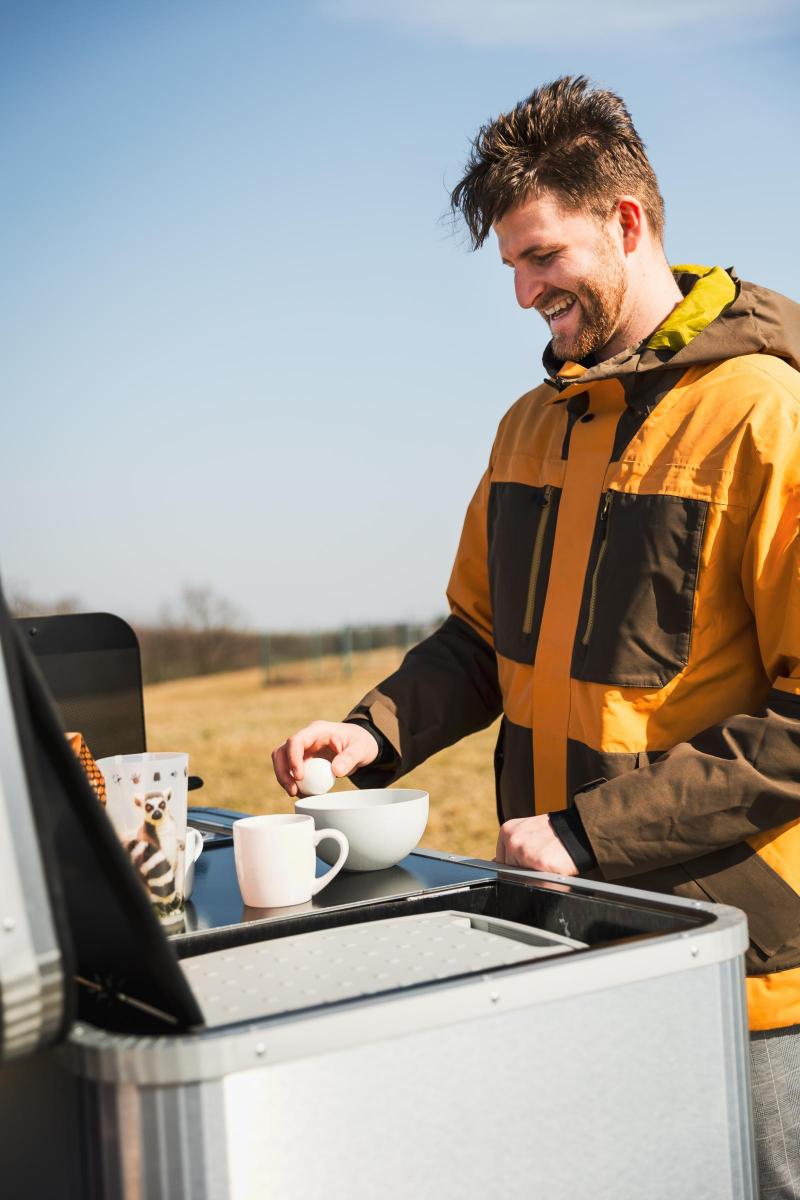 Box je univerzální a lze jej dát za téměř jakékoliv auto, které má tažné zařízení do 80 kilogramů. „Nabízíme celkem tři varianty boxu. Základní obsahuje sporák, samotný box, kde jsou i dva šuplíky a úložný prostor pro plynovou bombu a kanystr s vodou, a samozřejmě nosič a dodání. Střední varianta obsahuje i lednici. A pak máme prémiovou verzi, kde lze vybírat z 19 barev boxu, plus obsahuje kempovací zásuvku a osvětlení pracovní plochy. Cenově se pohybujeme od 60 do 80 tisíc korun, podle výbavy. Spotřebiče jsme vybrali v nejvyšší kvalitě, a to jak kvůli designu, tak především životnosti,“ popisuje Kubín.