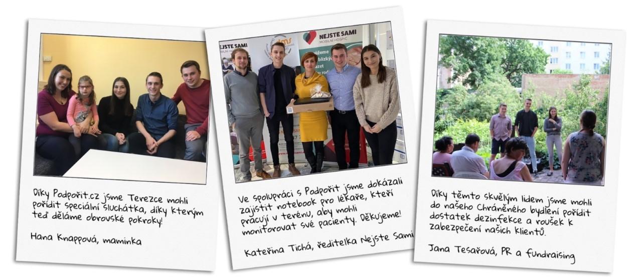 Že by ale s Podpořit přestali, nikoho z nich nenapadlo. Radim Oulehla a Ondřej Machač se jednoznačně shodují, že jim projekt dává obrovský smysl i dobrý pocit. „Není to tak, že bychom jen někam převedli peníze a tím to skončilo. Vždycky nás zajímá konkrétní příběh. Vybíráme peníze na konkrétní věci, jako bylo naslouchátko, canisterapie. A vybranou částku pak jedeme osobně předat, takže máme možnost se zaměstnanci i klienty konkrétních neziskových organizací mluvit. A potkávat se, povykládat a moci pomoct je k nezaplacení,“ potvrdil Machač. Radim Oulehla pak ještě dodává, že zkušenosti a znalosti, které už za rok fungování získali, by jim nabídlo jen málokteré studium či zaměstnání. Doufají tak, že v budoucnu budou mít díky tomu oproti vrstevníkům na trhu práce výhodu a náskok.