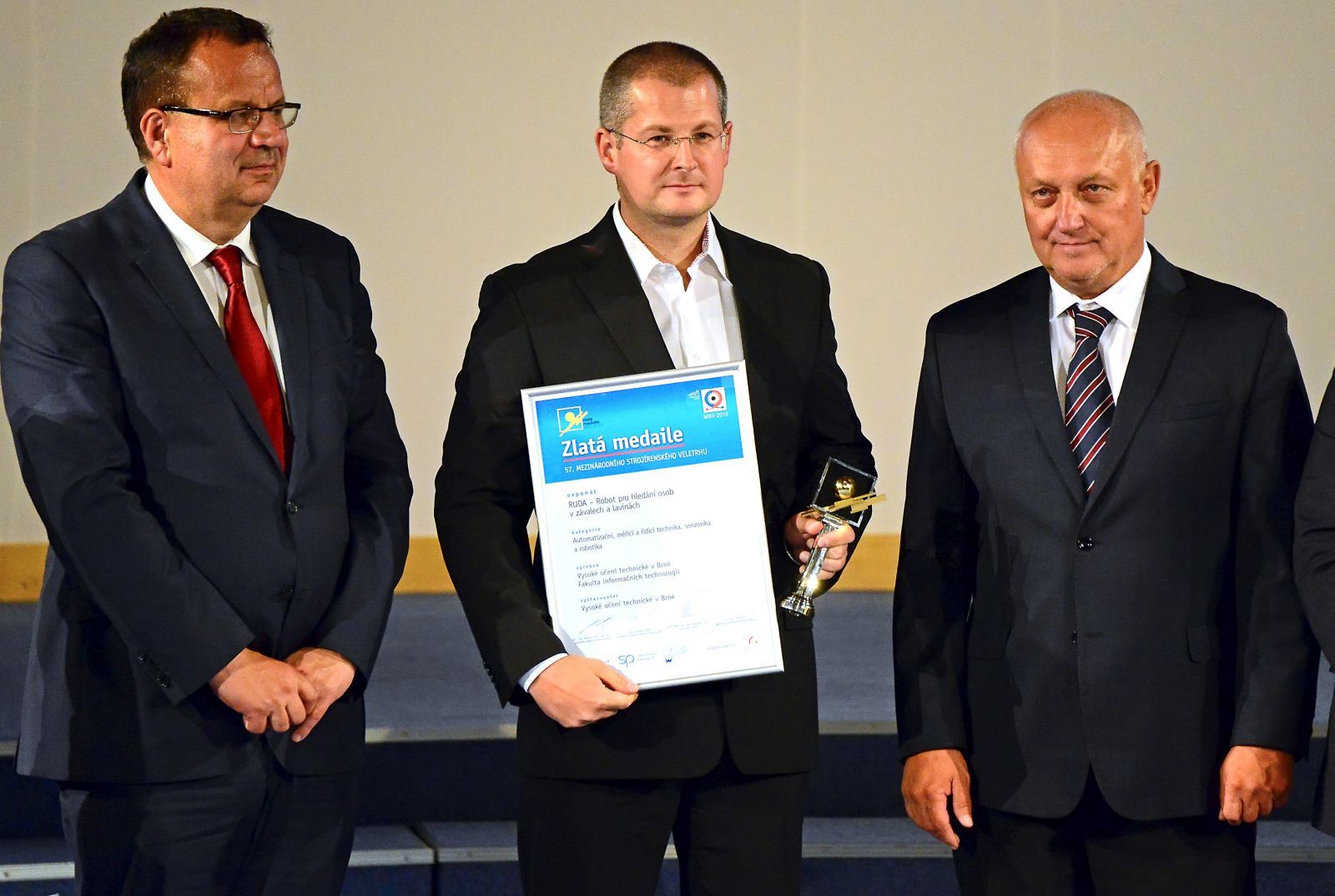 Unikátní robot RUDA z laboratoří Fakulty informačních technologií VUT v Brně získal Zlatou medaili na letošním ročníku Mezinárodního strojírenského veletrhu. Zvítězil v kategorii pro automatizační, měřicí a řídicí techniku, senzoriku a robotiku. Vědecký tým Martina Drahanského z Fakulty informačních technologií VUT v Brně pracoval na vývoji robota čtyři roky. Jeho hlavním úkolem je hledání osob v závalech a lavinách. Díky bioradaru najde živého člověka až dvacet metrů pod povrchem, aktuálně vědci omezili hloubku na pět metrů, protože vyprošťování z větší hloubky je velmi náročné. „Tímto bioradarem je náš robot výjimečný. A také tím, že ho oproti zahraniční konkurenci dokážeme sestrojit za nižší cenu. Jsem pyšný zejména na to, že jsme ho celého sestavili sami. Na vývoji se podílel deseti až patnáctičlenný tým složený zejména z našich doktorandů, přizvali jsme jednoho externího odborníka, který nám zpracoval mechatroniku,“ informoval Martin Drahanský.