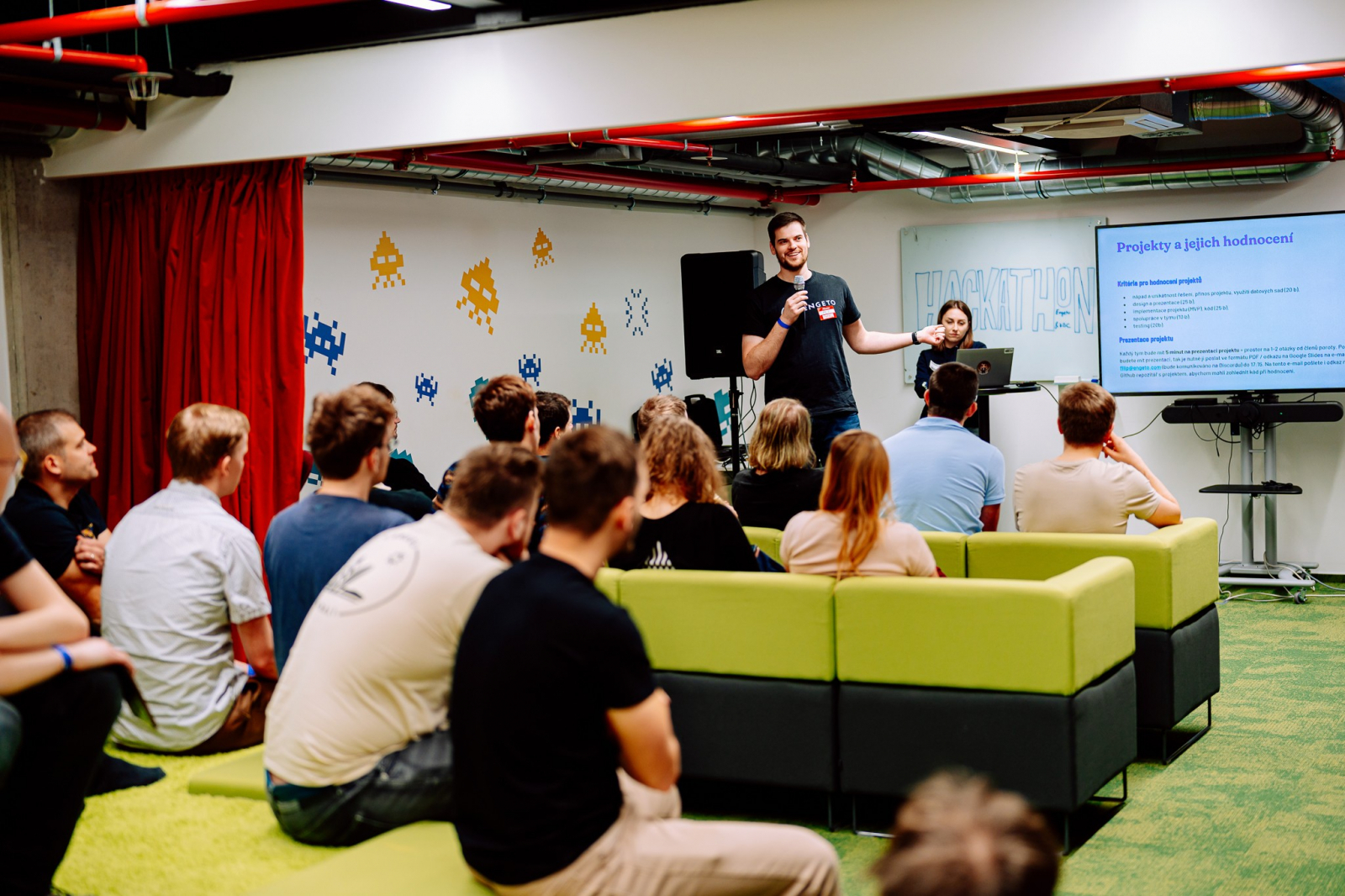 Filip Holec s účastníky Hackathonu, který ENGETO pořádalo. | Autor: archiv ENGETO