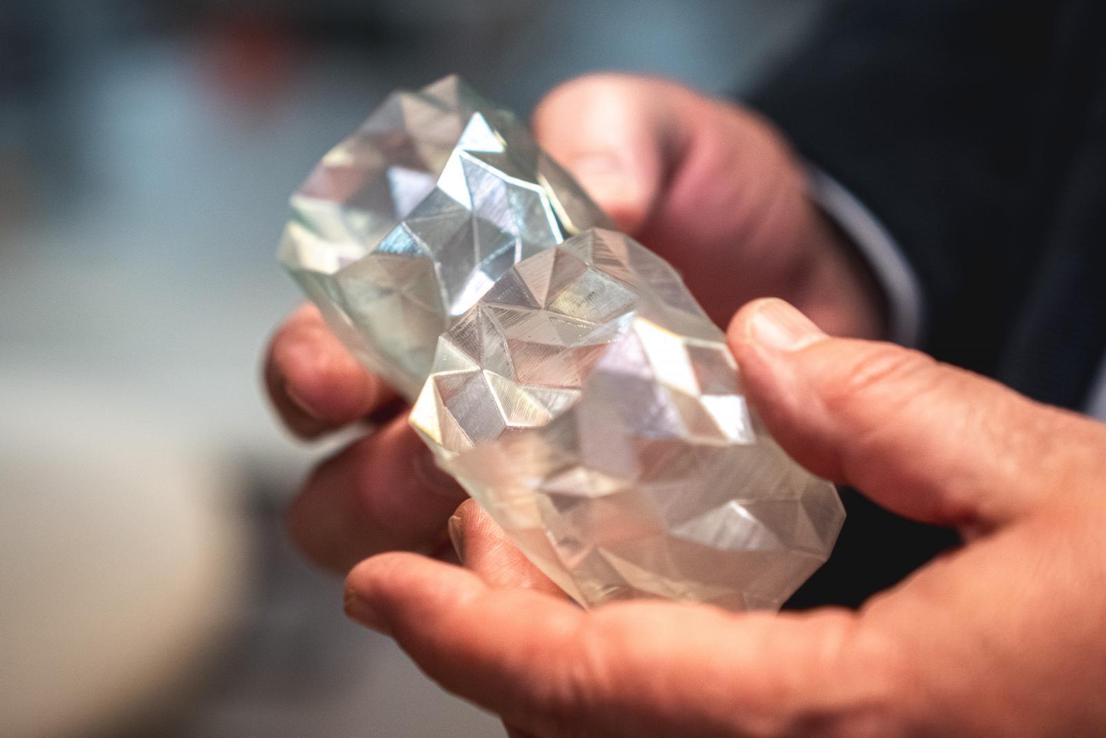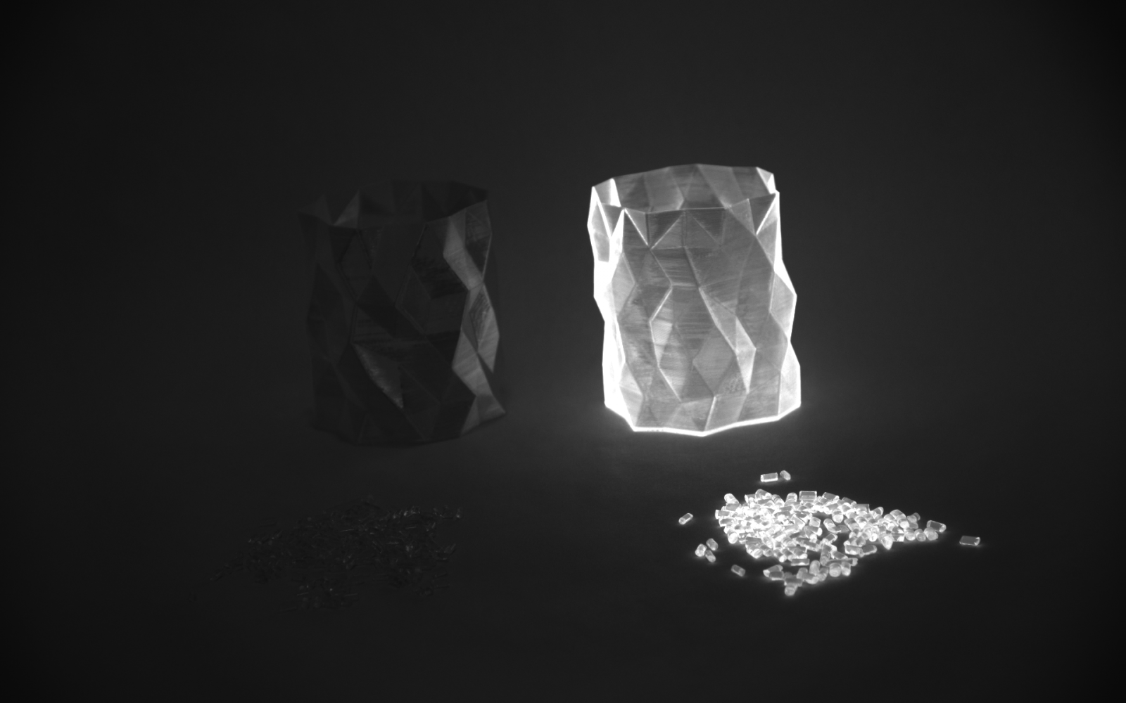 Výrobek z neznačeného PET vpředu a značeného markery vzadu. | Autor: Tomáš Malcher Řešení, na kterém výzkumníci z FCH VUT spolu s partnery pracují, je překvapivě elegantní: označit polymery neviditelnými značkami, které lze snadno a rychle rozpoznat stroji. Tyto značky nejsou lidským okem viditelné, takže nemění vzhled výrobků. Jsou čitelné pomocí světla v blízké infračervené oblasti a umožňují automatické třídění kamerami a strojovým viděním. „Cílem našeho výzkumu je, aby plast sám nesl informaci o tom, čím je. Neviditelná značka umožní strojům rychle rozpoznat typ polymeru a správně ho zařadit,“ shrnuje docent Dzik.