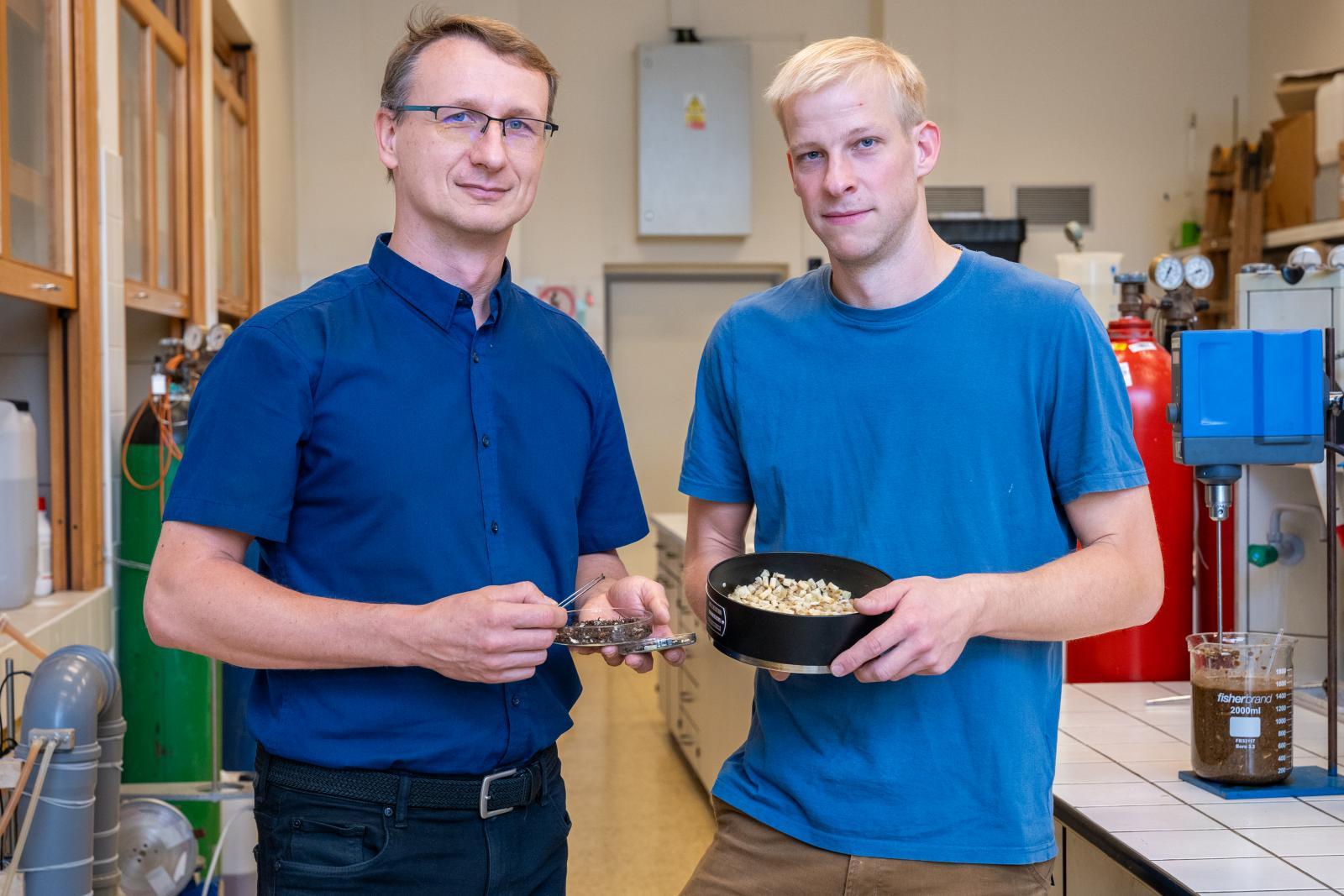 Nové způsoby materiálového využití aktuálně hledají i odborníci na bioplasty z Fakulty chemické VUT. Využívají metodu kaskádové recyklace náplní, která jim umožňuje z materiálové směsi postupně odebírat jednotlivé složky a nacházet jim nové využití jednodušeji než v nadrcené směsi. Kombinací separačních a purifikačních technologií s využitím chemických i mechanických metod tak lze získat téměř čisté materiály. Recyklací bioplastů se zabývá Radek Přikryl a Silvestr Figalla | Autor: Václav Koníček