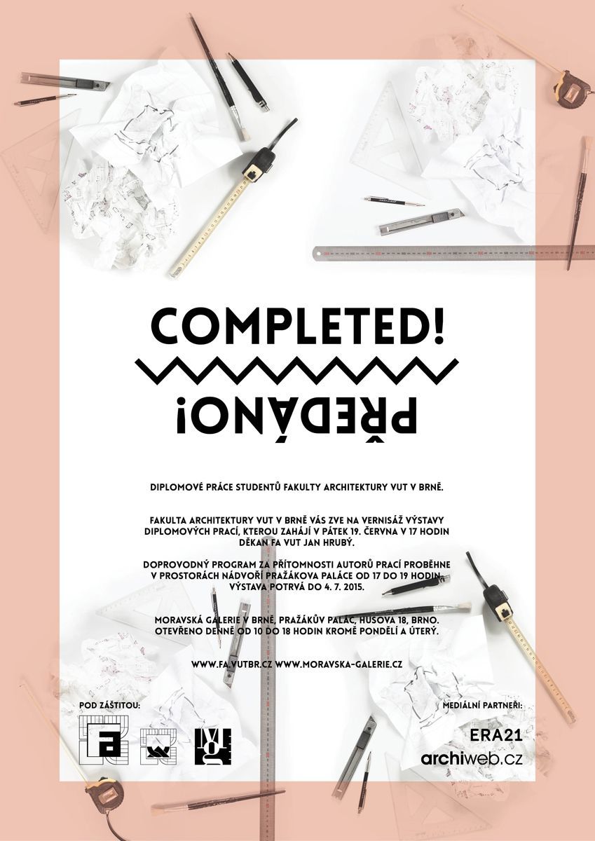 Přeměna bývalých kasáren, návrh lázní, obytné soubory, nový koncept Brněnské filharmonie. Práce na tato témata si mohou zájemci od soboty 20. června prohlédnout v brněnském Pražákově paláci. Koná se tam totiž výstava diplomových prací studentů Fakulty architektury Vysokého učení technického v Brně. Pod názvem Completed! Předáno! studenti prezentují svoje diplomové projekty poprvé mimo prostory fakulty a v takovém rozsahu. „Věřím tomu, že se návštěvníkům bude výstava líbit, mnohé z nich nejspíš překvapí, jak široký záběr témat naši studenti a pedagogové obsáhli. I to je jeden z důvodů, proč jsme se rozhodli poprvé ukázat diplomové práce, které jsou naší vlajkovou lodí, takto veřejně“ upozornila kurátorka Nicol Gale z Fakulty architektury VUT v Brně.