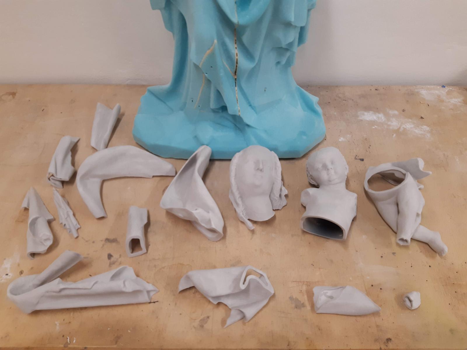 K tělu madony musel Jiří Pec 3D výtisky dolepit. | Autor: archiv Jiřího Pece Více než metr vysoká socha ženské postavy s dítětem neopustila dlouhé roky i kvůli své hodnotě místo na oltáři vimperského kostela čtyři metry nad zemí. A nejinak tomu bylo i letos v únoru, kdy se rozhodlo o pořízení kopie, kterou by mohli lidé vidět ve vimperském muzeu. „Sochař Lukáš Černý potřeboval udělat co nejvěrnější kopii nejlépe v měřítku jedna ku jedné. Nešlo ale, aby si vzal madonu do ateliéru jako předlohu a nešlo ji ani snést dolů. Dalším řešením v takových případech je si figuru namodelovat, ale to by trvalo dlouho, třeba i týdny. Samozřejmě nejjednodušší by bylo udělat odlitek. Forma se ale odlít nemohla, protože by se barevná vrstva, takzvaná polychromie, mohla kontaminovat formovacím materiálem a ty jsou hodně lepivé a mohly by sochu poškodit. Pak nás napadlo, že by se mohla madona oskenovat,“ popisuje důvody svého zapojení Jiří Pec z FaVU.