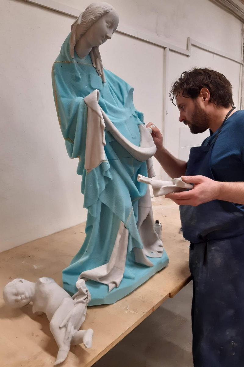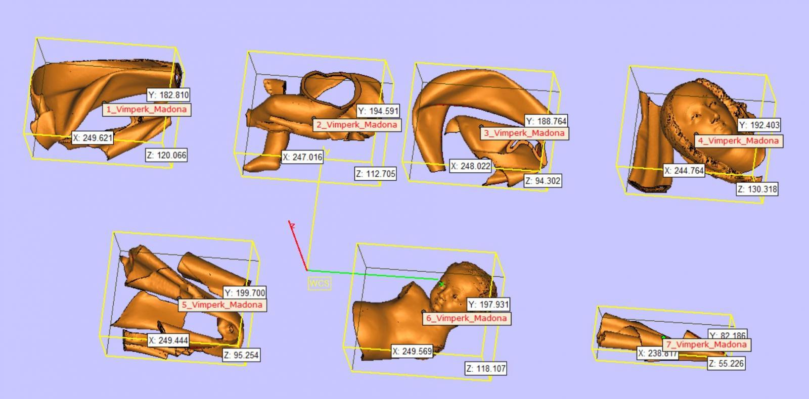 Prací v terénu ale úloha sochařů z FaVU neskončila. Data si Jiří Pec dovezl zpátky do Brna, kde je začal v počítači zpracovávat. Díky algoritmu se podobné snímky spojí v jednolitou plochu a obalí naskenovaný tvar. Výsledkem je tak předloha v realistické barevnosti a textuře. Pro sochaře, který měl zhotovit kopii Vimperské madony, bylo ale potřeba vytvořit trojrozměrný model ve skutečné velikosti. V tu chvíli povolal Jiří Pec na pomoc Dušana Váňu, který se v Kabinetu 3D technologií zabývá CNC obráběním. Ten s pomocí robotické ruky vyřezal na základě upravených dat získaných skenováním sochu z bloku polystyrenu. Jemné detaily, jako třeba obličej madony a dítěte nebo záhyby šatů, ale sochaři nechali vytisknout na 3D tiskárně. „Detaily jsem vytisknul ze sádrového kompozitu a na vyfrézovanou sochu jsem je dolepil. Je to vlastně taková skládačka,“ upřesňuje Jiří Pec s tím, že pouze fréza si s detaily neporadí, a 3D tisk celé sochy je dost náročný. Navíc mají někteří umělci rádi, když sochu dotváří lidská ruka, a ne pouze stroj.