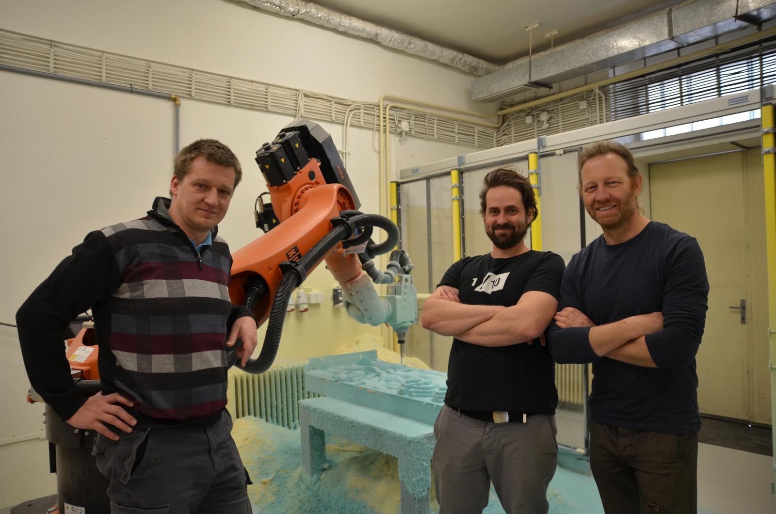 Dušan Váňa, Jiří Pec a Tomáš Medek u frézy, která z bloku dokáže vyřezat hrubé obrysy sochy. | Autor: Tereza Kadrnožková