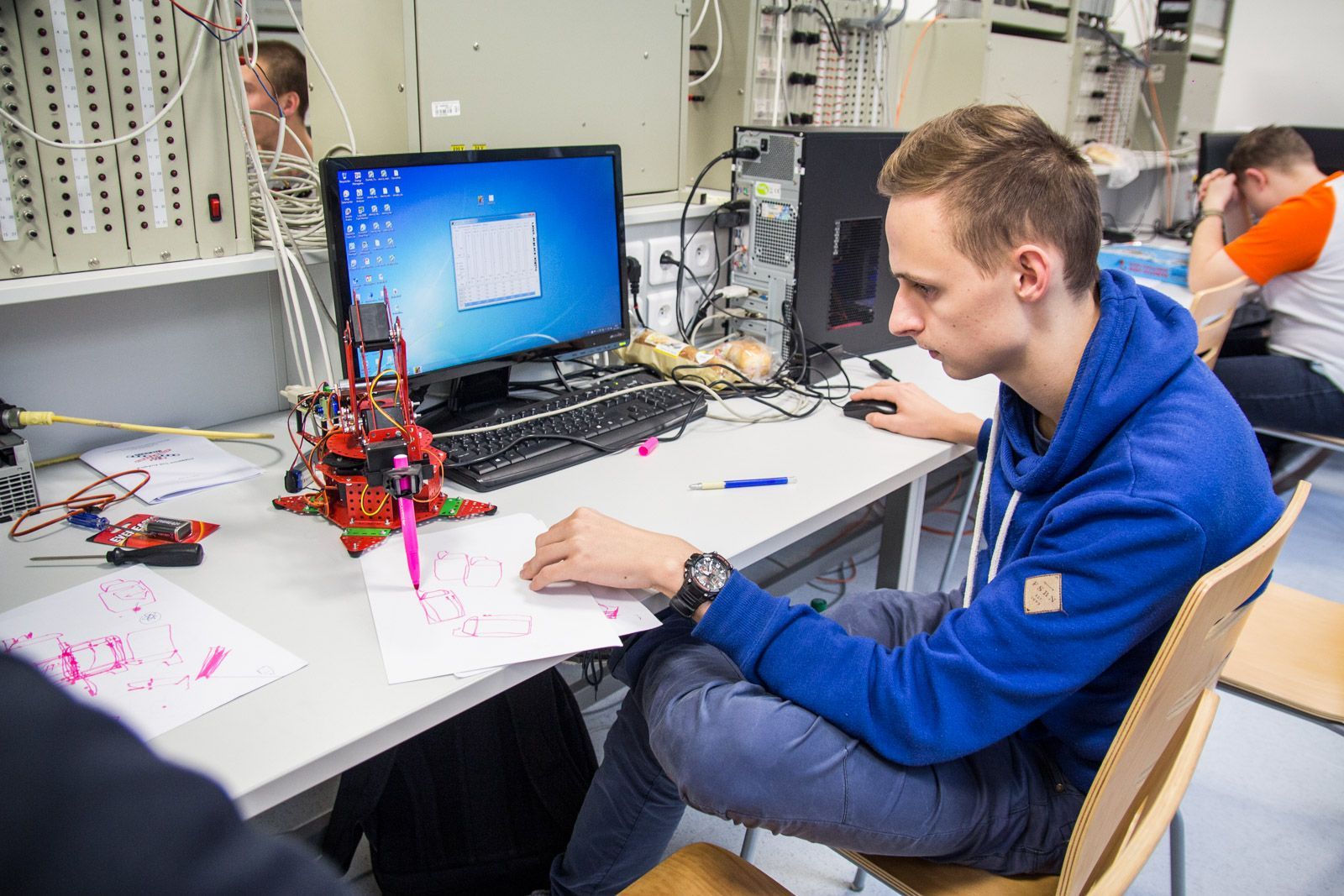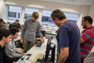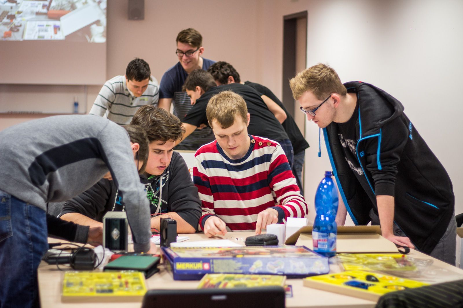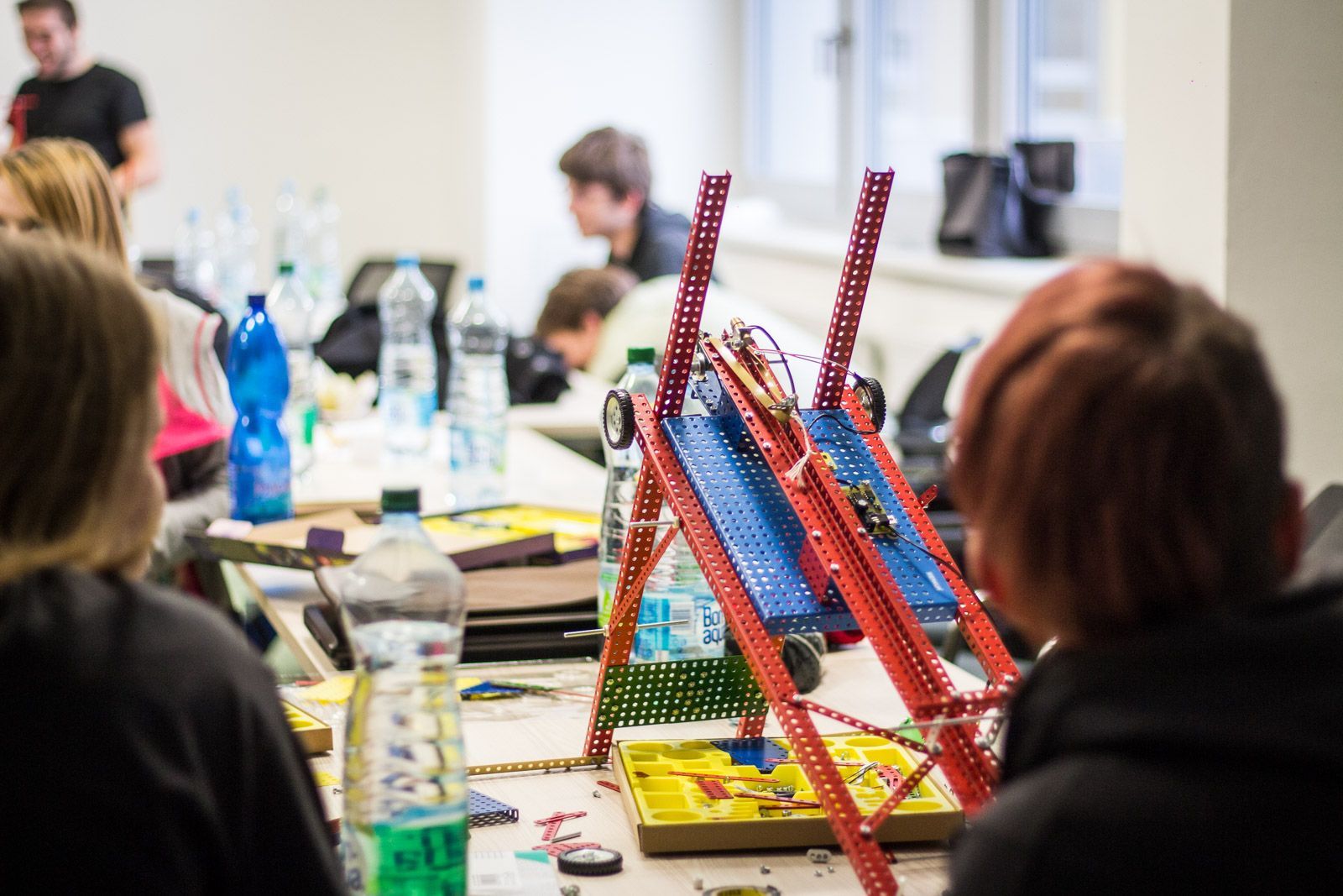 Po oficiálním zahájení se jednotlivé týmy přesunuly do učeben podle toho, jaké zadání si zvolily. Zatímco některé skupiny si jednoznačně rozdělily role už před začátkem celé soutěže (konstruktér, programátor, elektrotechnik), jiné týmy se teprve na místě rozhodují, kdo se bude věnovat jakému úkolu. Před desátou už začínají studenti dávat dohromady první součásti jednotlivých zařízení. "Jsou to funkční týmy, které spolupracují. Na těch studentech je i později vidět, že už mají nějaké zkušenosti," zhodnotil předpoklady jednotlivých soutěžících proděkan Jiří Háze.