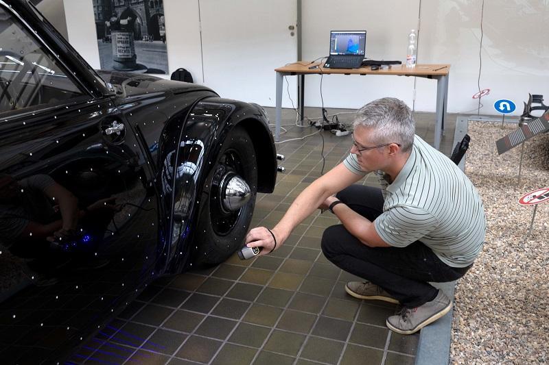 Skenování vozu v prostorách muzea | Autor: Národní technické muzeum „Model získaný skenováním bylo potřeba vyhladit a „zalepit“ u něj díry, které ve skenu zůstaly po kontrastních bodech. Výsledný sken je velmi detailní a skládá se asi z třiceti milionů malých trojúhelníků pospojovaných do jedné sítě. Pro potřeby 3D tisku haptického modelu byla tato síť výrazně zredukovaná a model byl zjednodušen,“ říká Koutecký. Podobně velký a zajímavý objekt dělali s kolegy potřetí, v minulosti už skenovali parabolickou solární elektrárnu a závodní tahač, pro který odborníci z Odboru průmyslového designu navrhovali novou kapotáž.