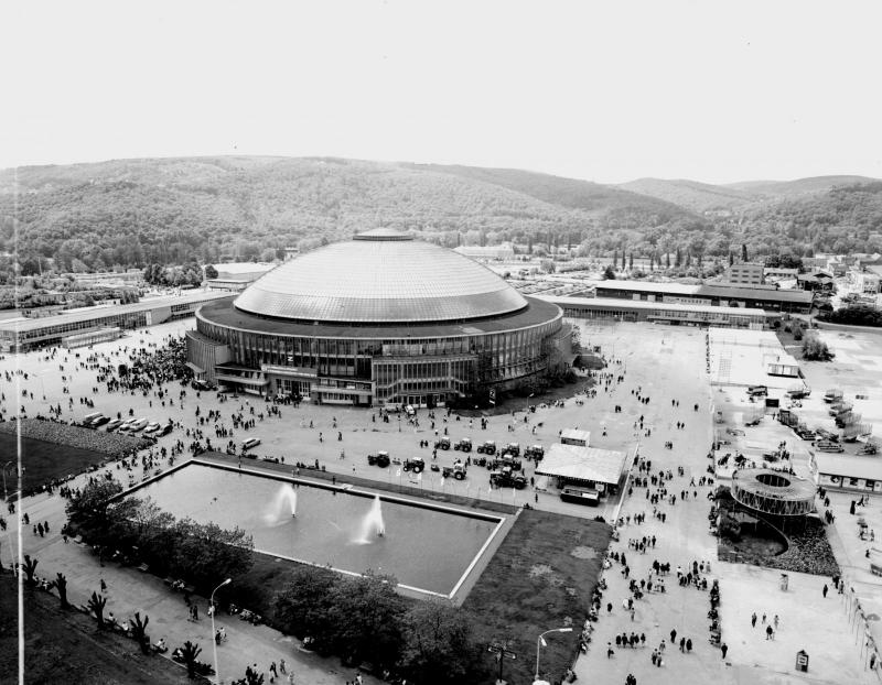 Historický letecký snímek pavilonu Z. | Autor: Archiv BVV Při rozhovorech s pamětníky a hledání v archivech narazila Lenka Štěpánková i na úplně nové informace. „Můj nejzajímavější objev se týká staveb z poválečného období, což jsou památkově chráněné pavilony Z a C. Hrozně mě překvapilo, když jsem zjistila, že dříve měly plastovou průsvitnou kopuli. Původně to bylo na pavilonu Y, potom na pavilonu C a na pavilonu Z to byl jenom vrcholek. Šlo o jedno z prvních použití plastů ve stavebnictví.“ Vlastnosti materiálu ale příliš nehrály v jeho prospěch a v průběhu času byl nahrazen plechem. „I na to chci poukazovat, že kulturně-historický význam nespočívá vždycky v tom, co se dochovalo dodnes, ale také ve skutečnosti, že architektura výstavních prostorů umožňovala experimentování,“ připomíná zároveň Štěpánková. Výstavní areály je podle ní těžké chránit jako celek, protože se velmi často mění. Nevyhovující budovy jdou k zemi a místo nich se staví moderní. Stejně tak tomu bylo v minulosti v Brně. Třeba pavilon M je už třetí toho jména a také pavilon D několikrát změnil nejen podobu, ale také polohu. Rotunda na historické fotografii. | Autor: Archiv BVV