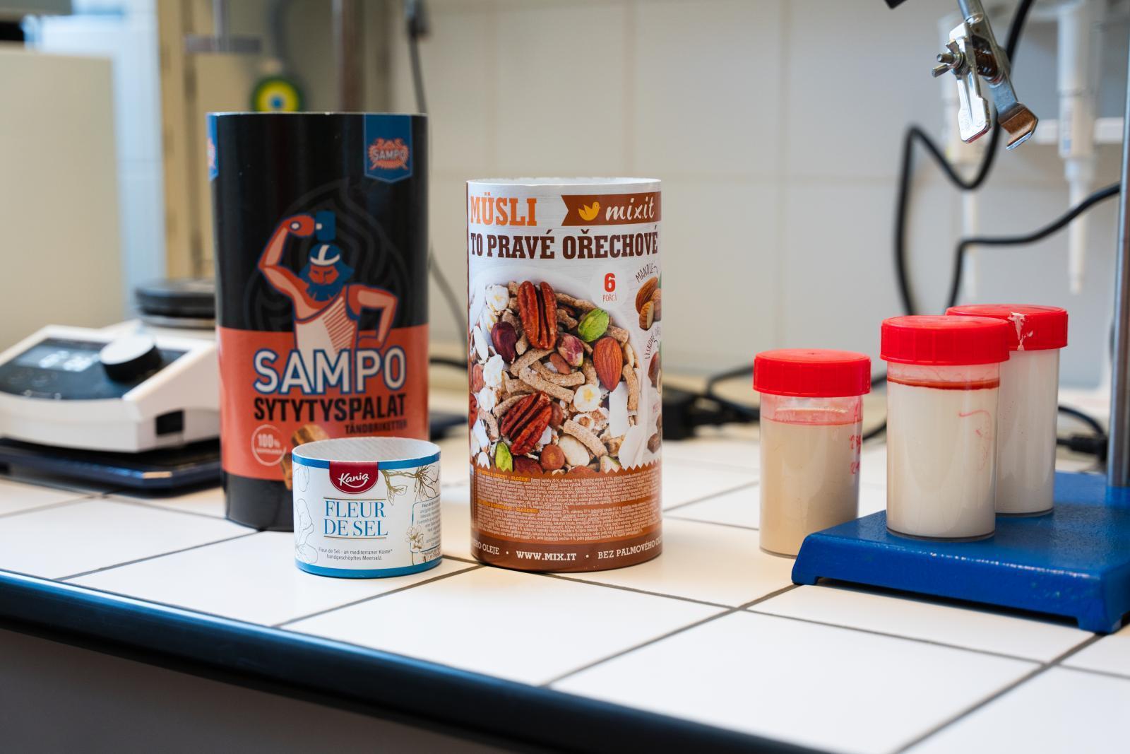 Při vývoji nových lepidel je zásadní detailní materiálová rešerše. Zkoumá se složení plniv (např. vápence, kaoliny, mikroplniva) a jejich kompatibilita se systémem. Klíčovou surovinou je dextrin vznikající úpravou škrobů, např. z brambor, kukuřice nebo fazolí. Různé druhy dextrinů se liší strukturou a vlastnostmi, a proto se jejich výběr přizpůsobuje konkrétní aplikaci. Například bramborový dextrin je vhodnější pro tekutější lepidla, zatímco fazolový poskytuje vyšší viskozitu „Testovali jsme v Polsku jeden vzorek s fazolovým dextrinem na ochranné hrany, které jsou i součástí projektu. V tomhle případě šlo o takzvané U-hrany – do nich se třeba vkládá monitor, aby byl chráněný ze všech stran,“ popisuje Tomáš Solný. „Přijeli jsme s kolegou, nasadili lepidlo na stroj – bylo sice trochu hustší, ale to by ještě nevadilo. No a uprostřed zkoušky vypadla elektřina. Ten test jsme domlouvali čtyři měsíce, dva roky tam proud nevypadl, a zrovna když tam jedeme, tak bum,“ směje se.