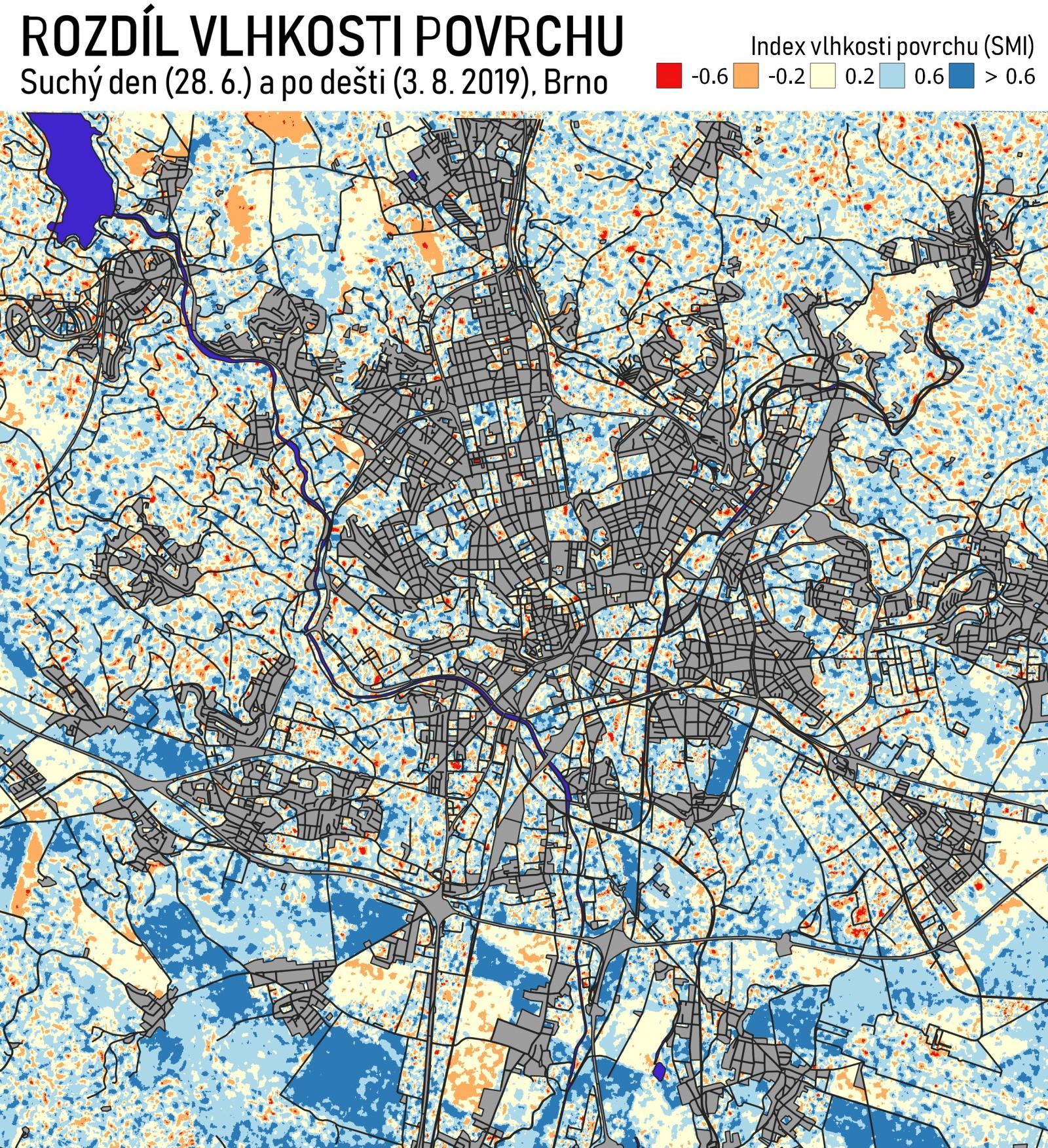 Rozdíl ve vlhkosti povrchu města během dvou letních dní – jednoho v době několikadenního tepla, druhého po vydatném dešti | Autor: Archiv World from Space