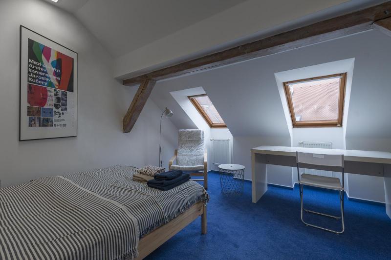 Ona sama se věnuje především komplexnějším instalacím. Na začátku tak byla její představa o výsledku velmi rámcová. „V předloženém projektu šlo spíše o vyjádření určitého životního postoje. Zachytila jsem úvahy, nad kterými jsem v té době dumala, a během rezidence jsem je pak rozvinula a dotáhla celý koncept do zdárného konce. Vznikla tak výstava s názvem Prsten na parkovišti,“ popsala Štindlová, která si pochvaluje zejména dostatek času na ujasnění celkového pojetí. „Jsem pomalý tvůrce a potřebuju si věci hodně rozmýšlet,“ podotkla. Své nápady navíc mohla zkonzultovat s umělci z celého světa, kteří se v Domě pánů z Kunštátu na pobytech vystřídali. V rámci rezidence získá umělec vlastní pokoj i ateliér | Autor: Michaela Dvořáková