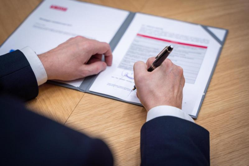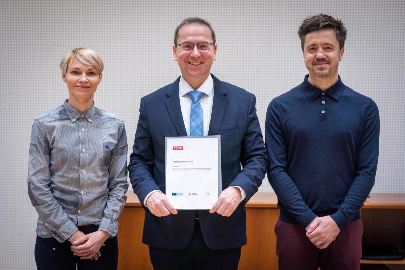 Zleva: Koordinátorka procesu udržitelnosti Kateřina Myslivcová, rektor Ladislav Janíček a prorektor Milan Houser s novou Strategií udržitelností VUT. | Autor: Václav Koníček