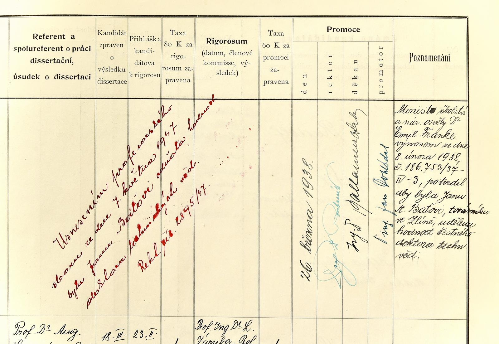V pořadí čtvrtý doktorát se rozhodl profesorský sbor udělit v roce 1926, a to přímo tehdejšímu prezidentovi republiky, Tomáši Garrigue Masarykovi. Slavnostní předání diplomu se uskutečnilo na Pražském hradě za přítomnosti zástupců vysoké školy. Stejná čest se dostala i dalšímu prezidentovi, Edvardu Benešovi, o jedenáct let později, za zásluhy o osvobození státu a podporu technické práce a technických věd. „Dne 16. března 1937 se Brno těšilo z návštěvy prezidenta Edvarda Beneše. Při této příležitosti neopomenul zavítat také na českou techniku, která nově nesla jeho jméno. Vrcholem návštěvy pak byla slavnostní promoce čestným doktorem technických věd za přítomnosti vedení školy, profesorského sboru, členů vlády, jakož i zástupců z kruhů poslaneckých, vědeckých, duchovních a vojenských,“ popsala Dobšíčková.