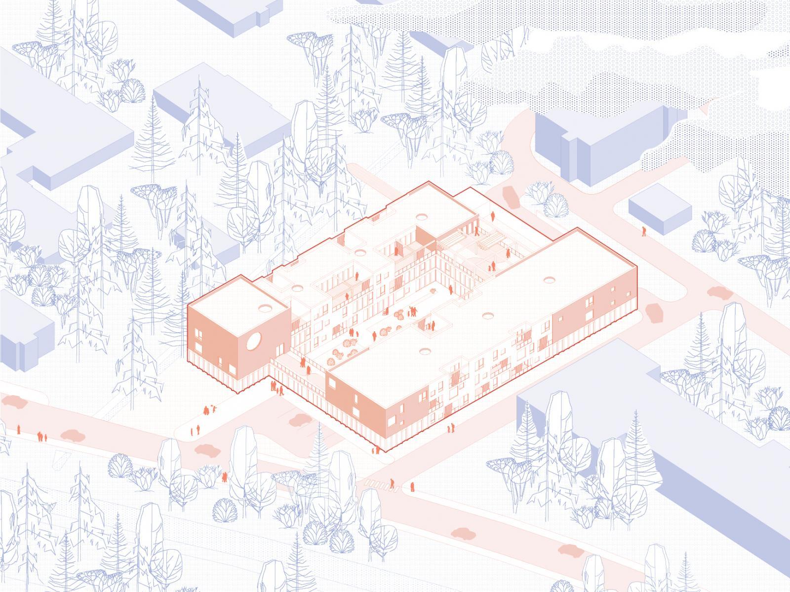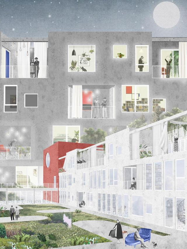 Návrh nového zlínského domova důchodců | Autor: Johana Krejčí, Magdaléna Buzová Prostor k interaci poskytují terasy, které mohou propojovat i jednotlivé byty. Vzniká tím šance k vytvoření malých sousedských komunit, které jsou připomínkou života mimo seniorské zařízení. Všechny terasy jsou opatřeny závěsy, pro dny, kdy si prostě „nechcete povídat“. Individualitu ale respektují i společné prostory, a to jak společenskou místnost a chodbu, tak i exteriéry. Například v případě atrií, kdy se mezi jednotlivými bloky nachází prostory „živé“, zatímco u parku na severozápadě budovy jsou to prostory „intimní“.