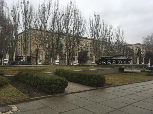 Výhled z okna ubytovny na tank. | Autor: Lukáš PodešvaPřejeli jsme ke studentským kolejím a Julia mi pomohla vyřešit ubytováni. Nějaké základy ukrajinštiny jsem si předem nastudoval, ale její pomoc vše usnadnila. Oficiálním jazykem je samozřejmě ukrajinština, ale v běžném životě se velmi často mluví rusky. Ubytování bylo skromné, ale naprosto dostačující, internet fungoval dobře, topení hřálo a ve sprše tekla teplá voda. Při pohledu z okna jsem viděl menší park, ve kterém byl na mohutném podstavci legendární tank T-34.
