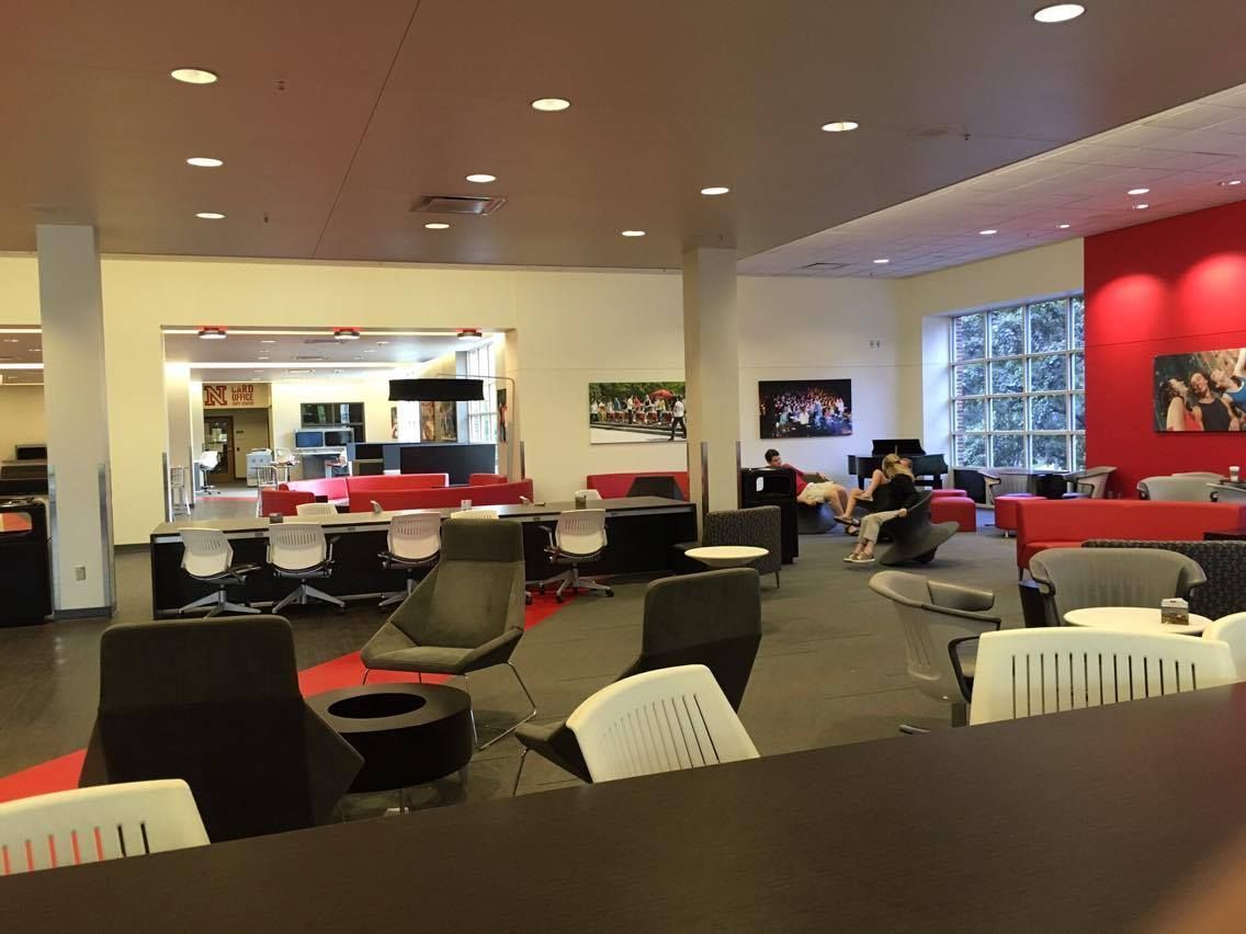 Je tu super zázemí! Jestli tohle čte i někdo z vedení školy tak Dobrý den! Máme tady úplně v centru campusu obří knihovnu, která je otevřená 24/7. Má klasický stoly, ale i křesla, místnosti s tabulí a televizí pro skupinový projekty, nebo místnost, kde si můžete natočit svoji prezentaci a kouknout se, jak hrozně u toho vypadáte, a co zlepšit. Taky je tam krb a Dunkin Donuts (prodejna donutů a kávy) otevřená 7am – 3am.